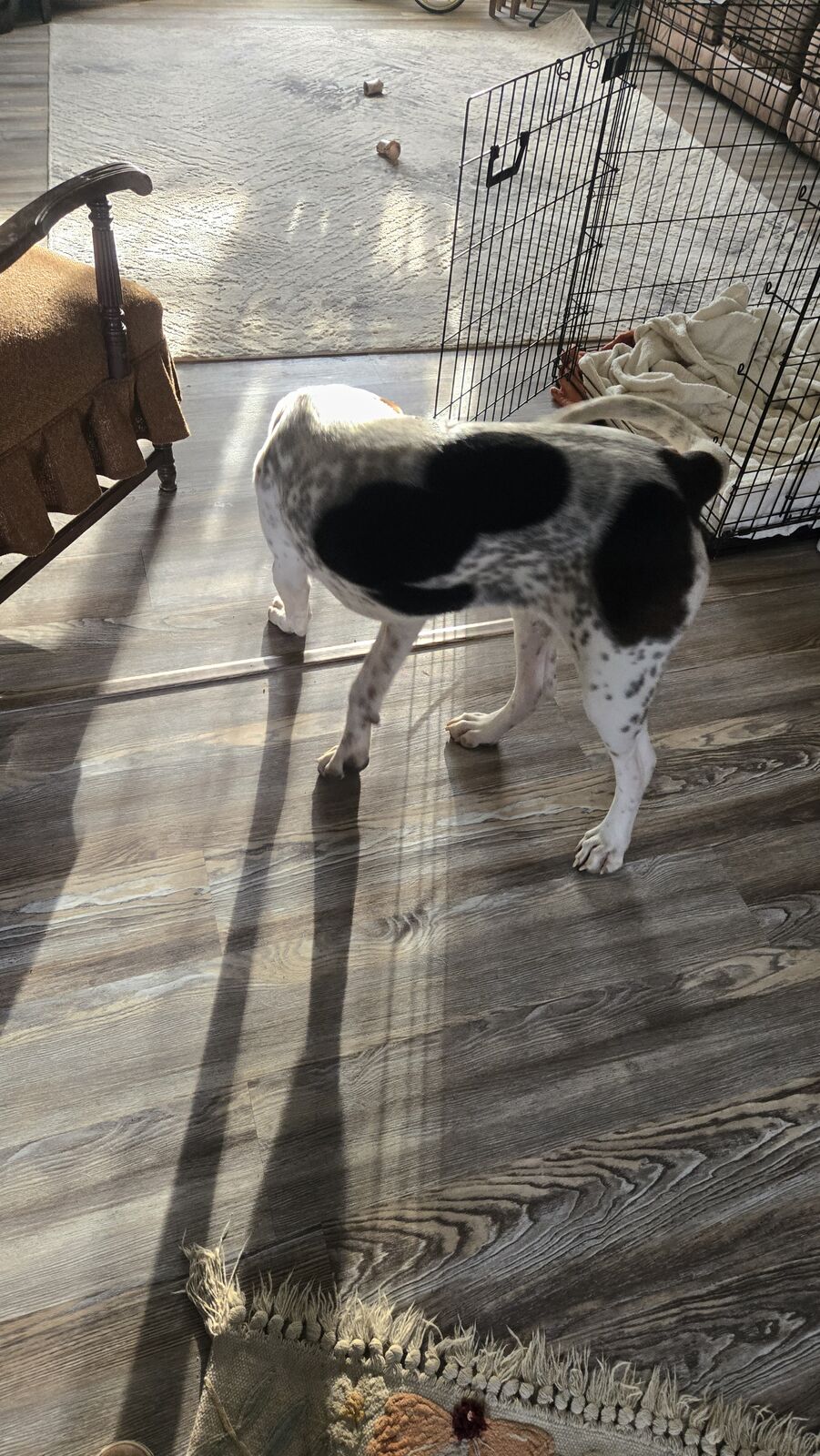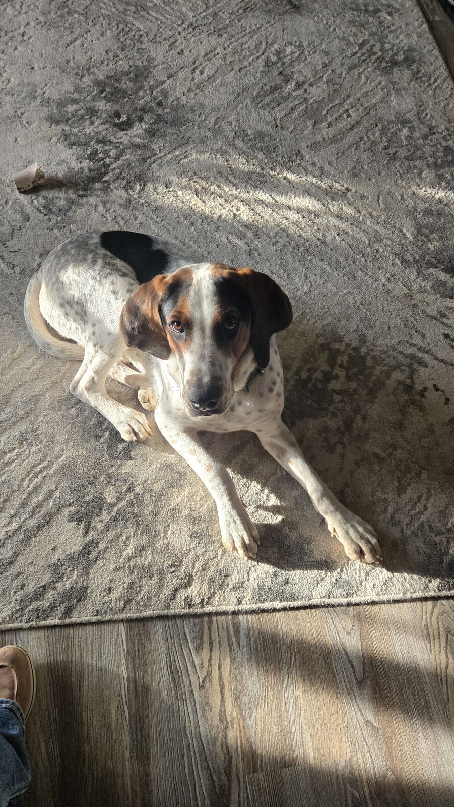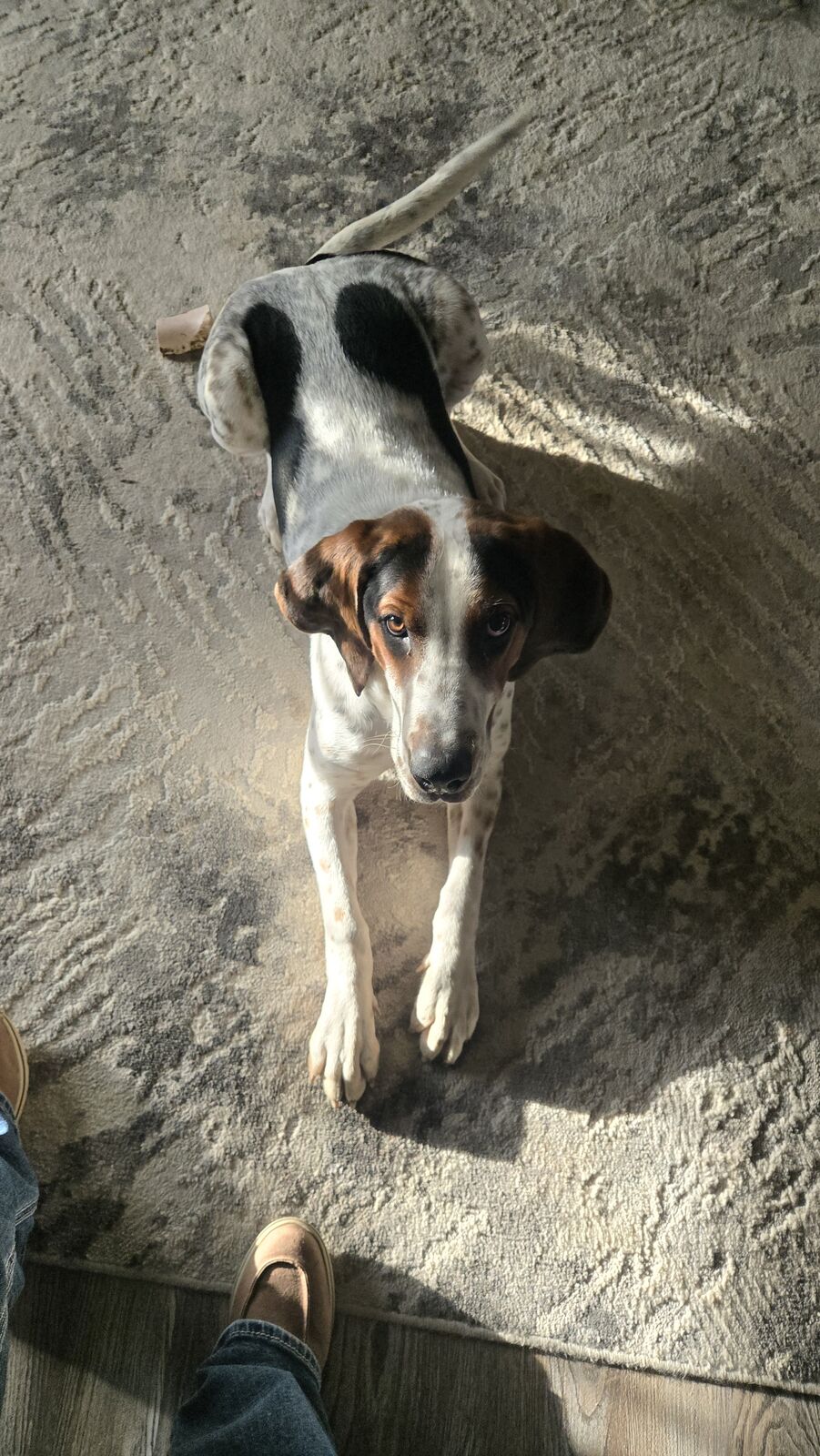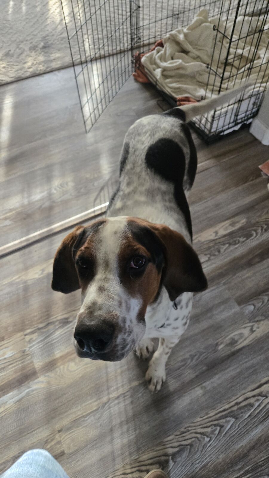 10 mon old Boy/ altered blue tick coonhound for rehome. Great young dog. Potty trained kennel trained all shots current micro chipped. Not papered. Been raised as family dog. Loves other dogs easy going with horses. Eager to learn. Learns very quick. Needs strong alpha human. Not great on leash. Does not bark all day. We live in Wyoming.