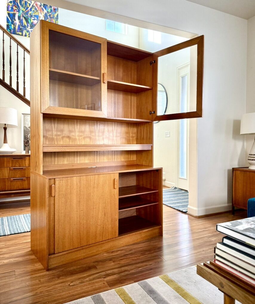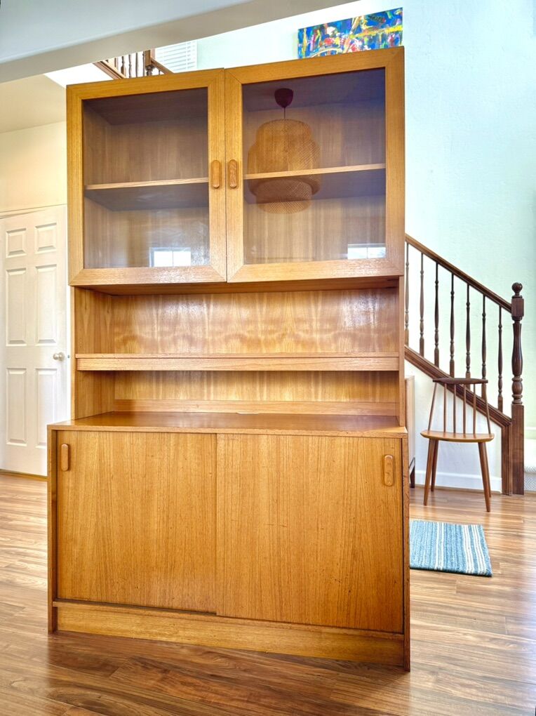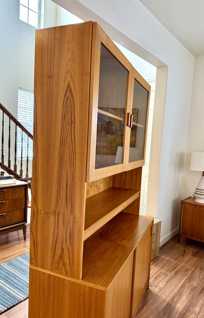 VenmoBeautiful vintage teak cabinet. Cool clean lines. Lots of storage space. Shelves behind sliding doors are adjustable. In excellent shape. This is a 2 piece cabinet. Made in Denmark. 48” W, 76” H, 18” D Possible delivery. Cash or Venmo No holds without payment.