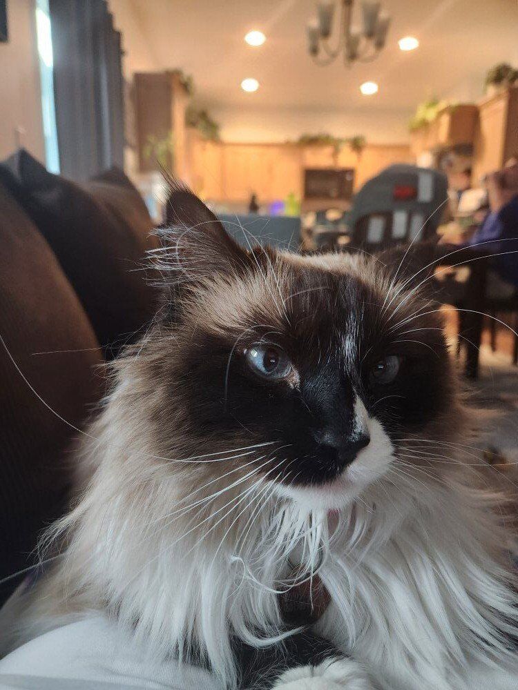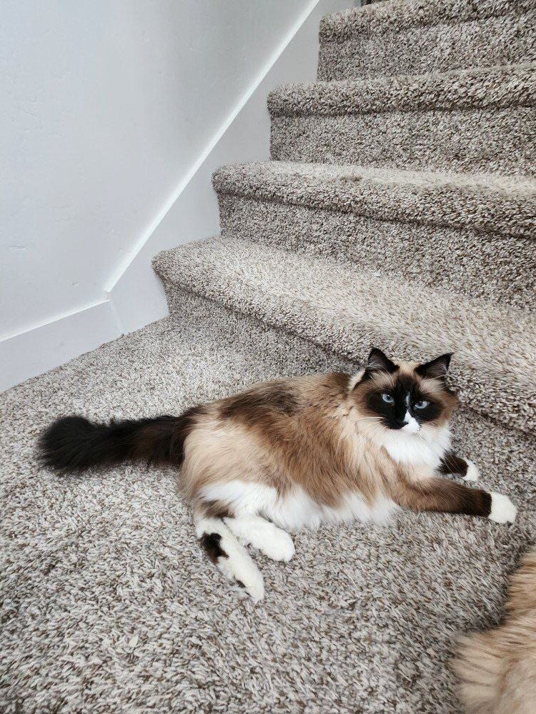 This is Bonnie. She is 10 lbs and was born on 03/30/21. She is spayed and is mostly an indoor cat. Unfortunately we need to rehome her. Unlike typical ragdoll cats, she does not like to be bothered by children. She has developed anxiety and has prescription food for her urinary health. She loves to be around adults. She will jump onto your lap and knead your stomach or thighs. She grew up with another cat, but she will need to be introduced to a new sibling very slowly because she is extremely territorial. But once she's comfortable she will have fun playing with them. She does NOT get along with dogs. She is very picky about her litter box, so she needs someone who will clean it out everyday to every other day. She is a very sweet cat and will be your new shadow. If you have any questions, please feel free to message me. Serious inquiries only please!