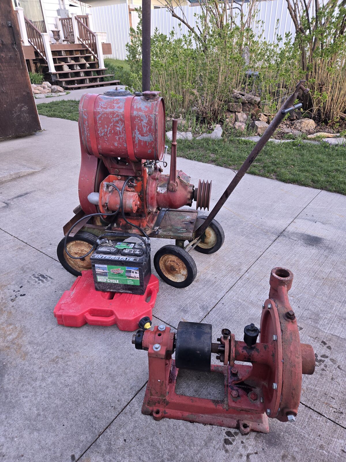 The pump is 1910 - 1915 spins easy .The engine is a AGND Wisconsin runs good and has a clutch. Have not pumped water with it yet.