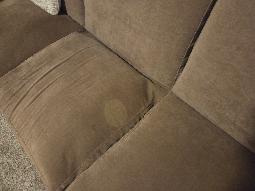 Used, but still some life in it. There is a small bleach stain, which we usually cover with a throw. One corner of the fold down part is a little wobbly, but not bad.