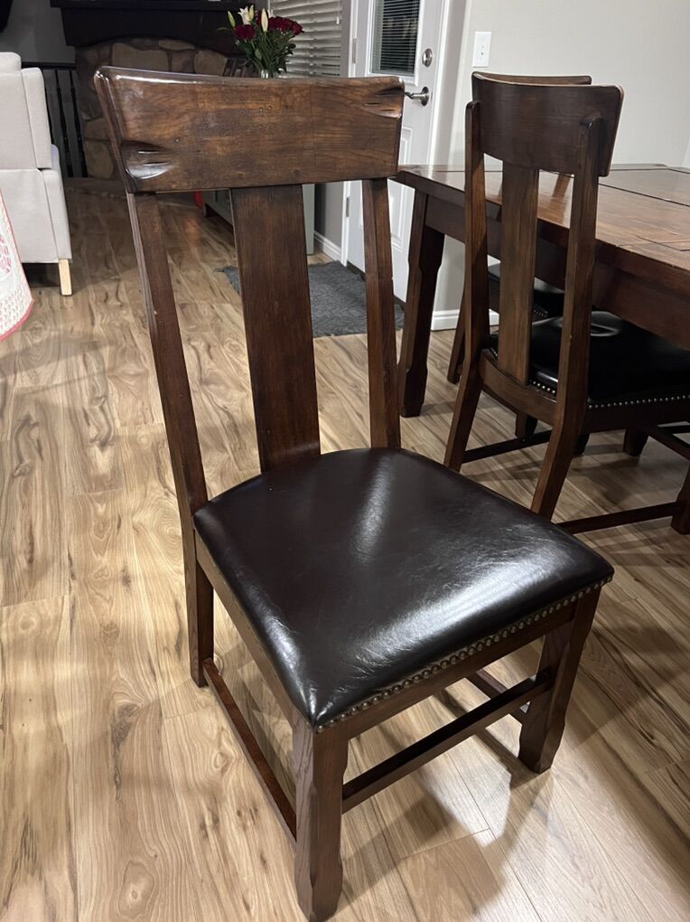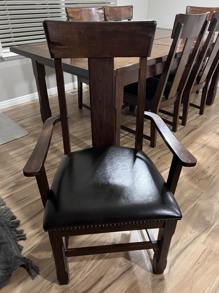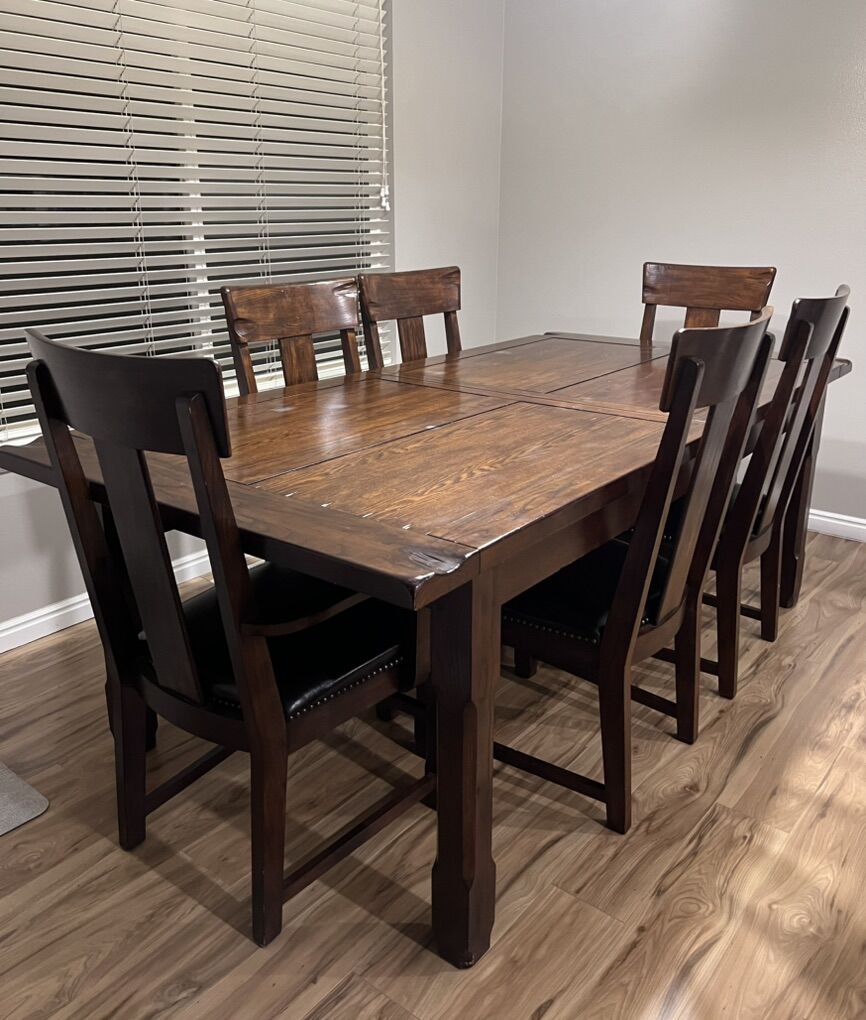 VenmoLarge, solid wood table, 86” x 43”. Has two leafs that store inside the table. They are 18” each, allowing you to extend the table an additional 18” or 36”. 6 chairs included, two of them are captains chairs. One chair has some damage to the seat (refer to last photo). Dark walnut color. Slight discoloration in some spots on the tabletop. (Looks like white spots). Bring a couple of strong men to help you carry it out, it’s very heavy. Pick-up in Provo. Cash or Venmo.