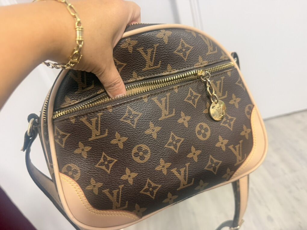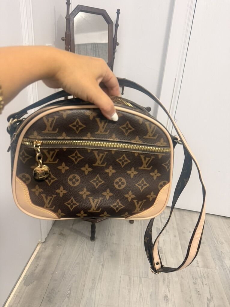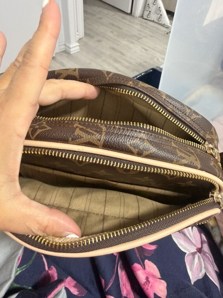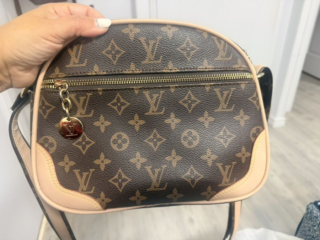 Venmo• Brown logo-style print with cream trim • Gold-tone zipper hardware • Adjustable crossbody strap • Multiple zip compartments for organization • Lightweight and easy to carry