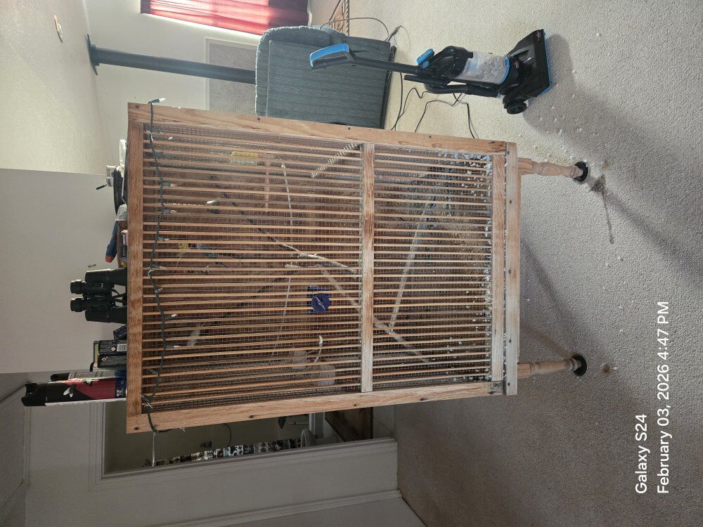 large bird cage, currently has 3 parakeets in the cage. we have had 4 doves in it before. Cage is 32" deep x 36" wide x 66"