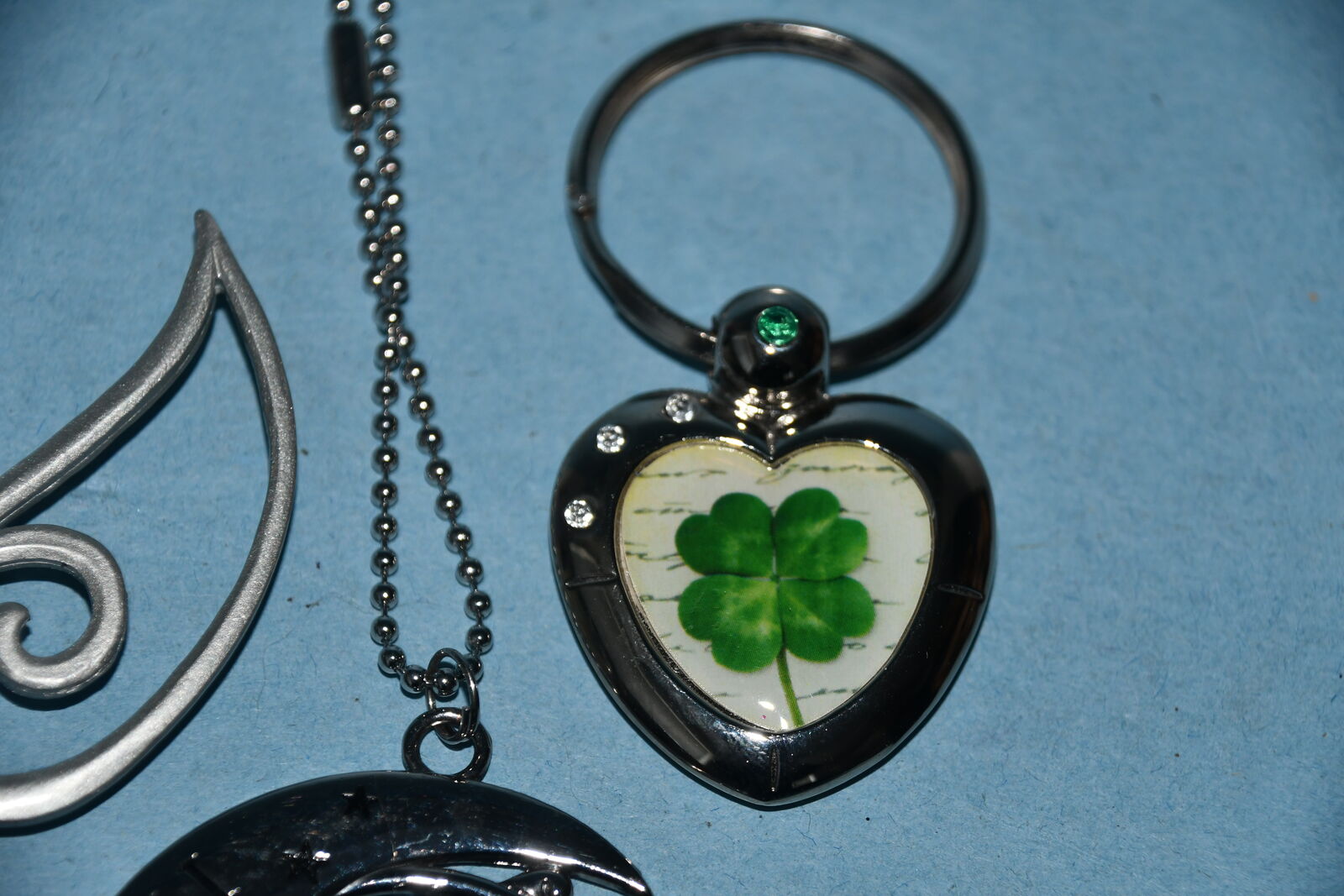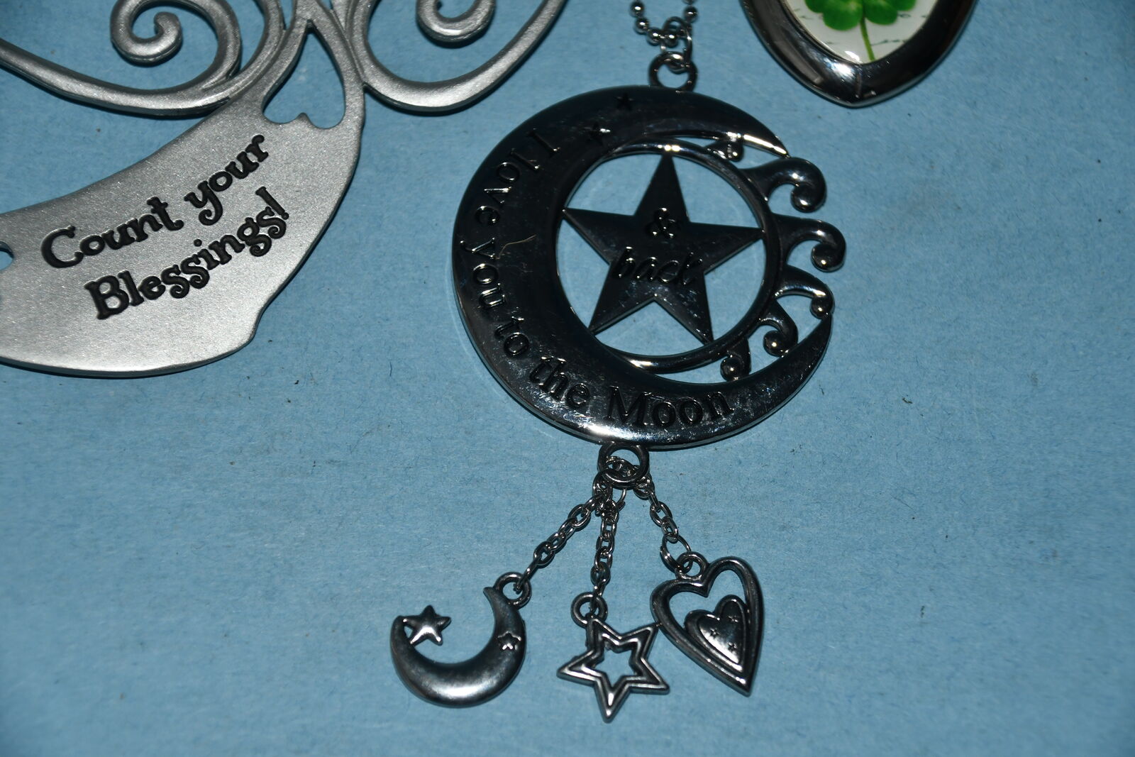This Set of 2 HANGING CHARMS + a 4 LEAF CLOVER KEY RING is from a smoke free home. The MOON CHARM is about 4" not including the chain. Questions??? Please ask. We are located in Plain City. Cash only please.