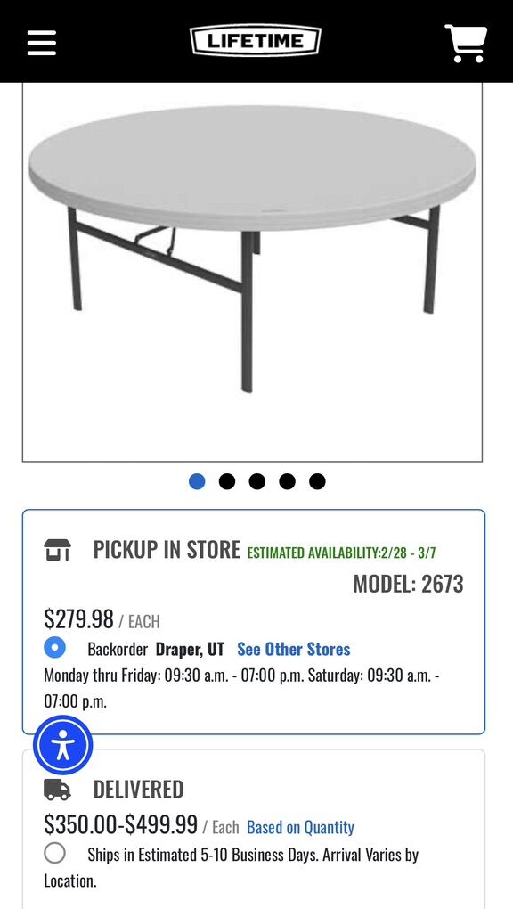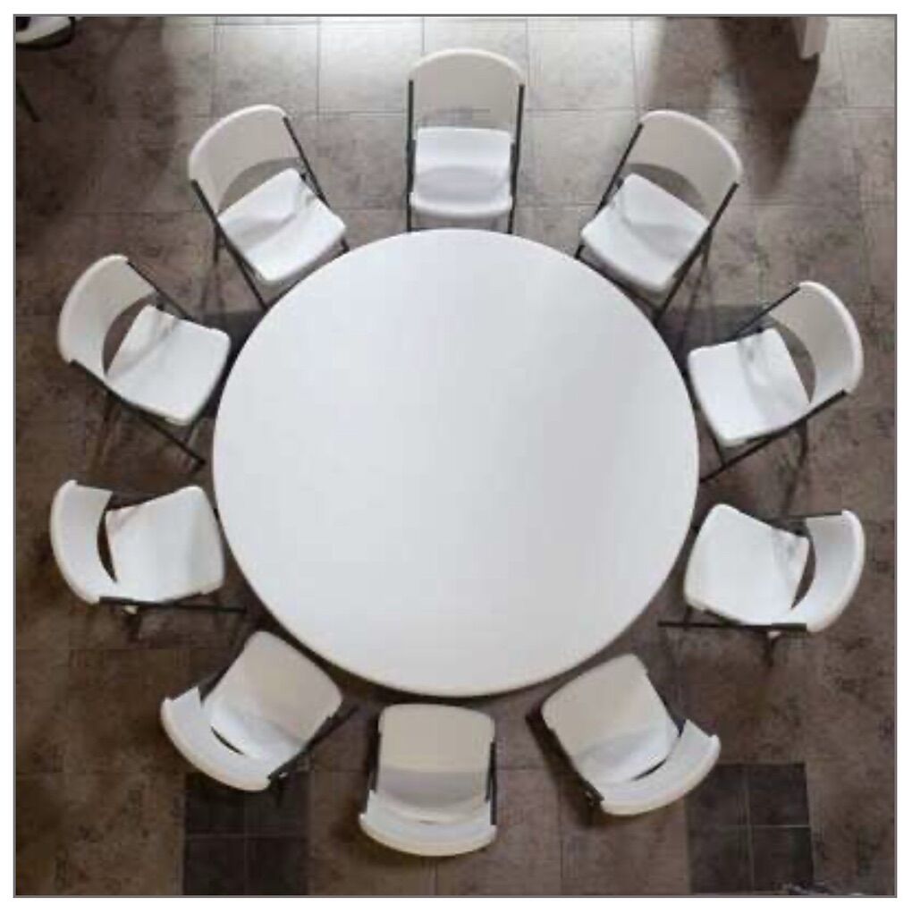 ApplePay8 like new 6’ round Lifetime folding tables w/cart for storage and transport. We bought these before our space was complete—3 months later we set them up one time and realized they are too big for the space. Could not return. Some lucky person will get like new items without having to assemble the cart or remove and dispose of the packaging! This set new was over $2500! Stored in Taylorsville. FREE DELIVERY anywhere in Salt Lake Valley, North to Farmington, South to Provo, or West to Grantsville.