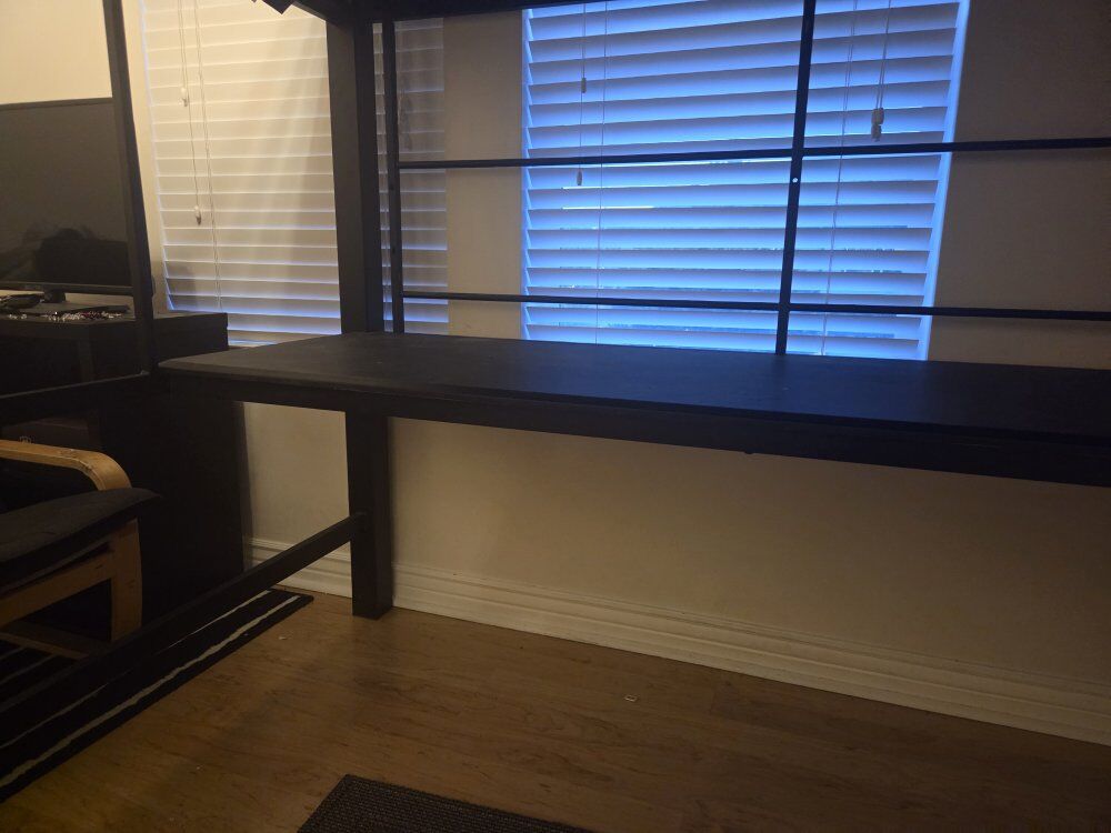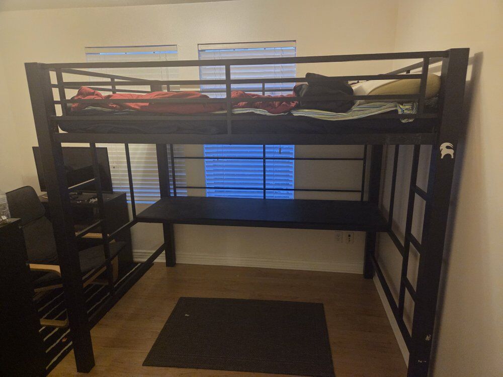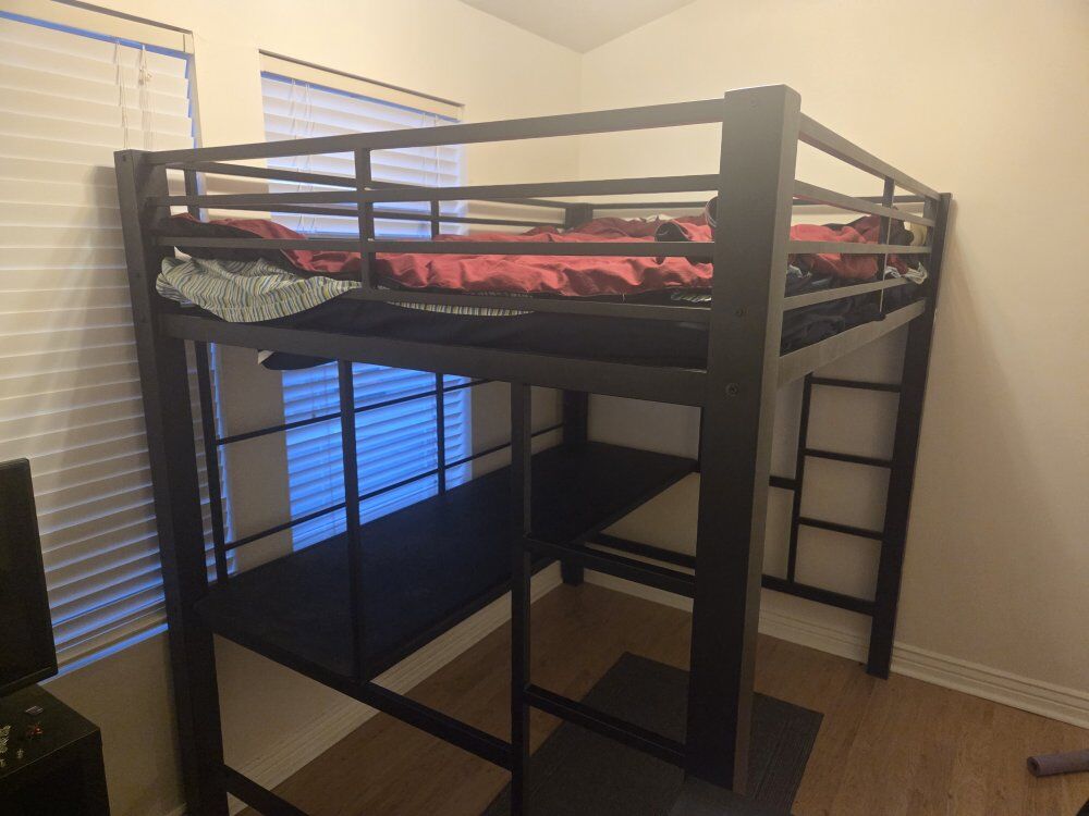 PayPalFor workaholics who never stop thinking about their next great innovation, this workstation loft bed is a godsend. Combine work and sleep in a modern way with demonstrable sophistication. Metal loft bed is finished in black. Below the bed is work area that includes desk. This bed is sturdy a 250lb person can get up here no problem.