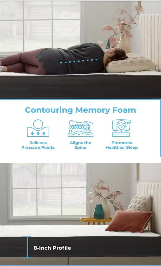HYBRID DESIGN: Get the best of both worlds with the combination of plush memory foam and durable springs that provide even support and lasting comfort FIRM FEEL: A layer of plush memory foam sits atop layers of support foam and springs to create a firm feel that provides excellent support for stomach and back sleepers COOL GEL INFUSION: If you sleep hot, you'll be glad to know our memory foam is infused with cooling gel that captures and dissipates heat to create a cool and comfortable sleep environment SUPPORTIVE SPRING BASE: With a base of tempered steel coils, this mattress has greater resiliency and provides lasting support without sacrificing the comfort you crave 8-INCH PROFILE: A low, 8-inch profile, makes this bed great for bunk beds and trundle beds. It is also a great transition bed and provides peak support for stomach and back sleepers