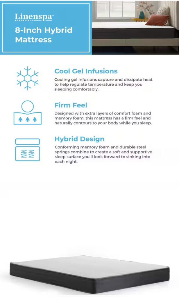 VenmoSettle in for a great night's sleep with the Linenspa Essentials 8 Inch Gel Memory Foam Hybrid Mattress. This cozy mattress has a firm feel stomach and back sleepers will love and a hybrid mattress design that provides the perfect combination of support and comfort. Memory foam mattress cradles your body while cooling gel infusions help regulate temperature, so you can sleep comfortably all through the night. Combined with a layer of classic steel coils that provide lasting support, this mattress in a box will effortlessly elevate any room in your home. With new technologies to enhance and protect your sleep, Linenspa Essentials is here to make sure comfort is always a top priority.