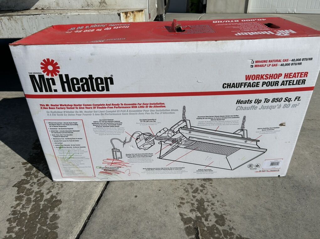 40,000 btu propane workshop heater. Brand new never opened. Thought I would use it but haven’t. Save yourself a little money.