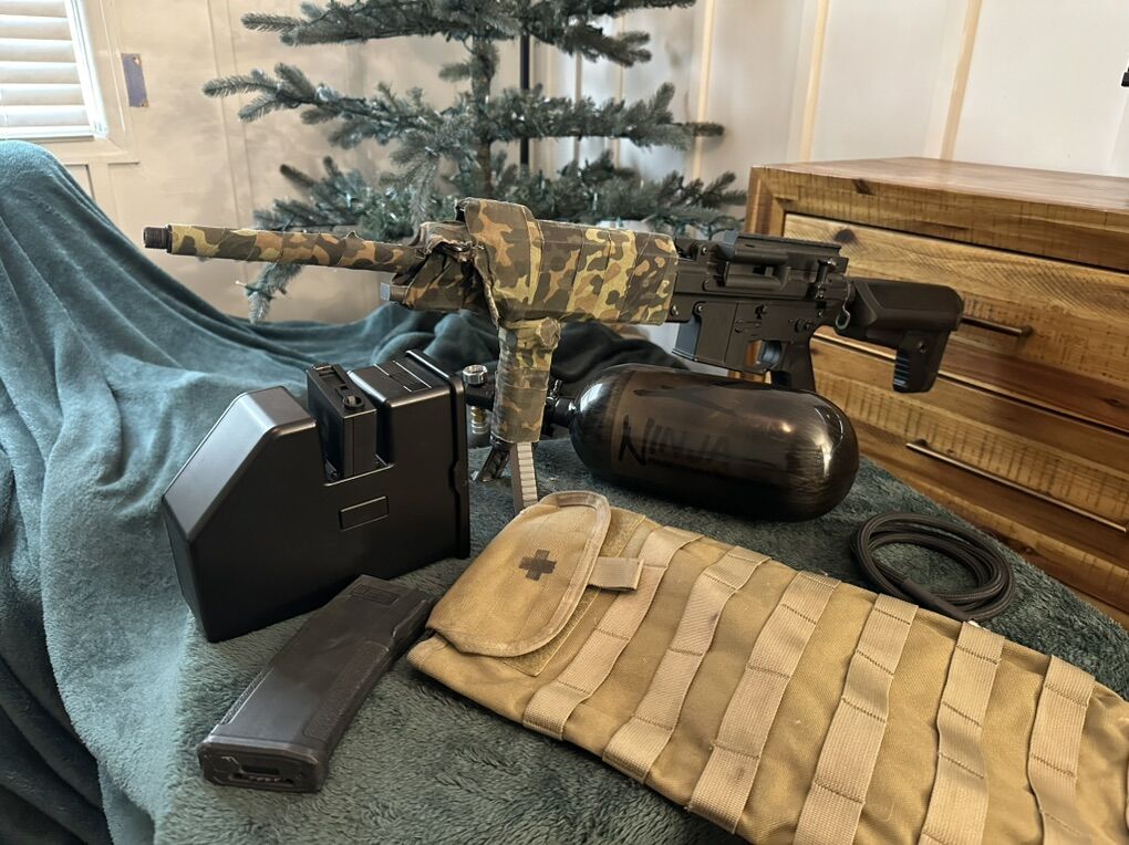 Comes with new Krytac box mag, it is the newest version and has a capacity of 5000 Hi cap m4 magazine Vertical bipod grip Ninja lite carbon fiber 90 4500 tank (will come with hose) Molle pouch for tank
