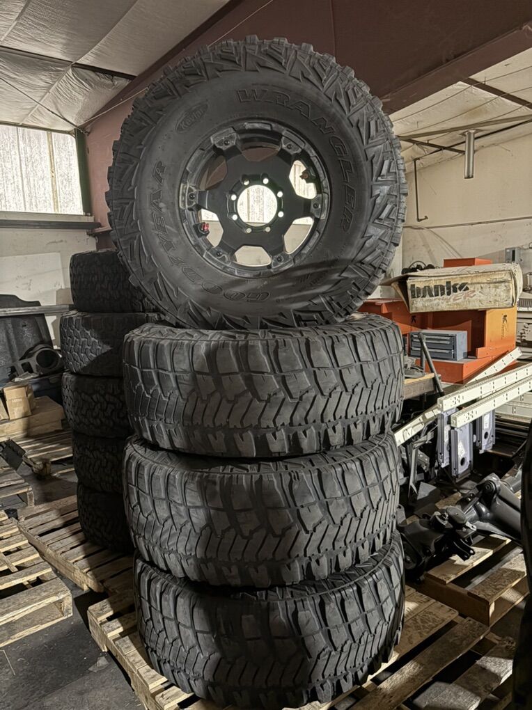 Black Teraflex Nomad hybrid 17x9”wheels with build in air down regulator valve, 8 on 6.5” bolt pattern and 4.75 B/S. 38x14.50r17 Goodyear MTR’s mud terrain tires Asking $800 for all 4 tires and wheels