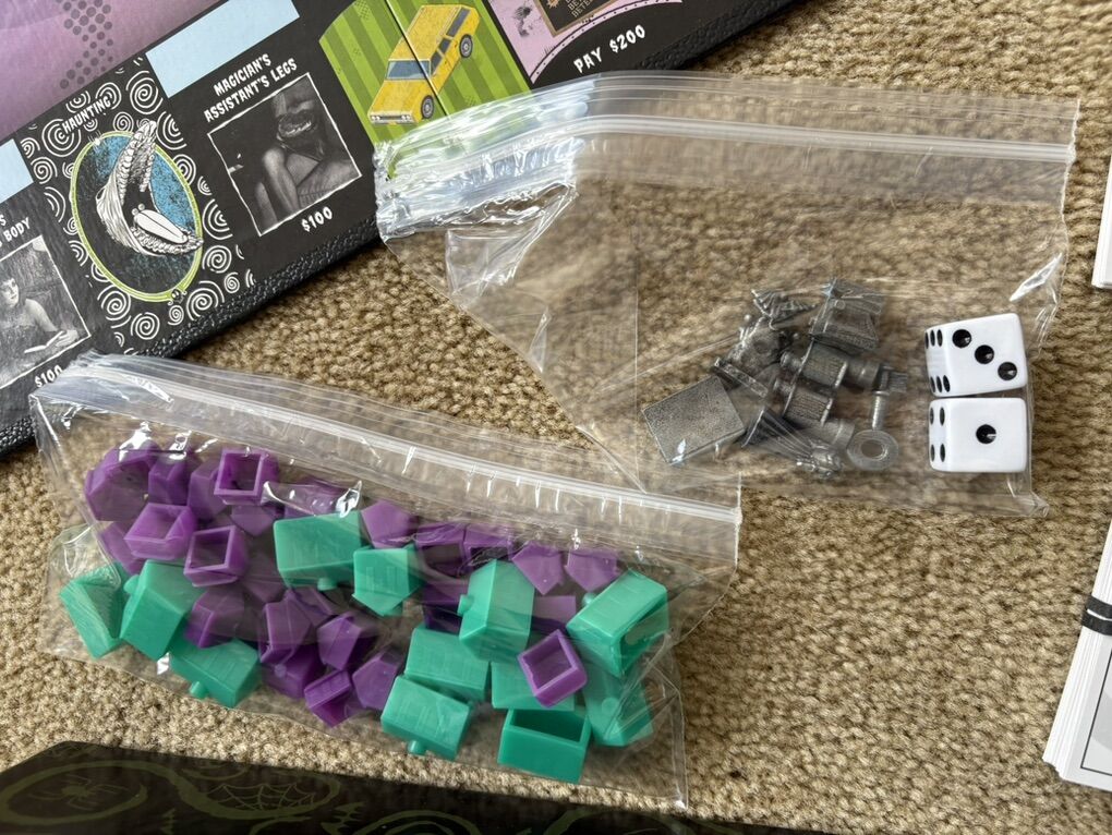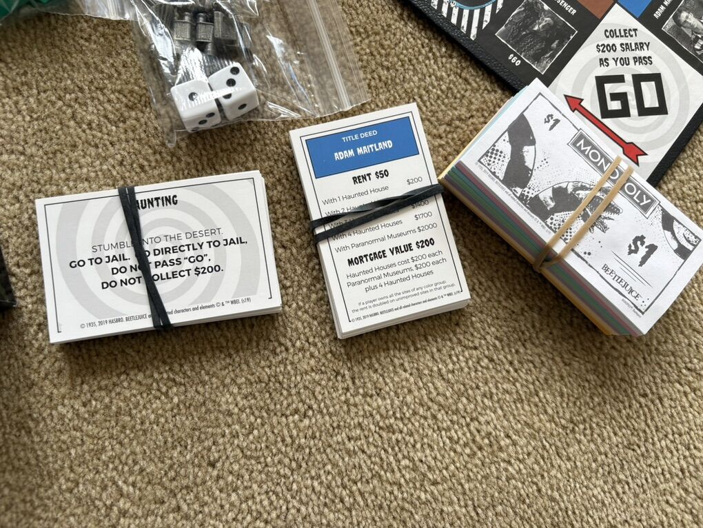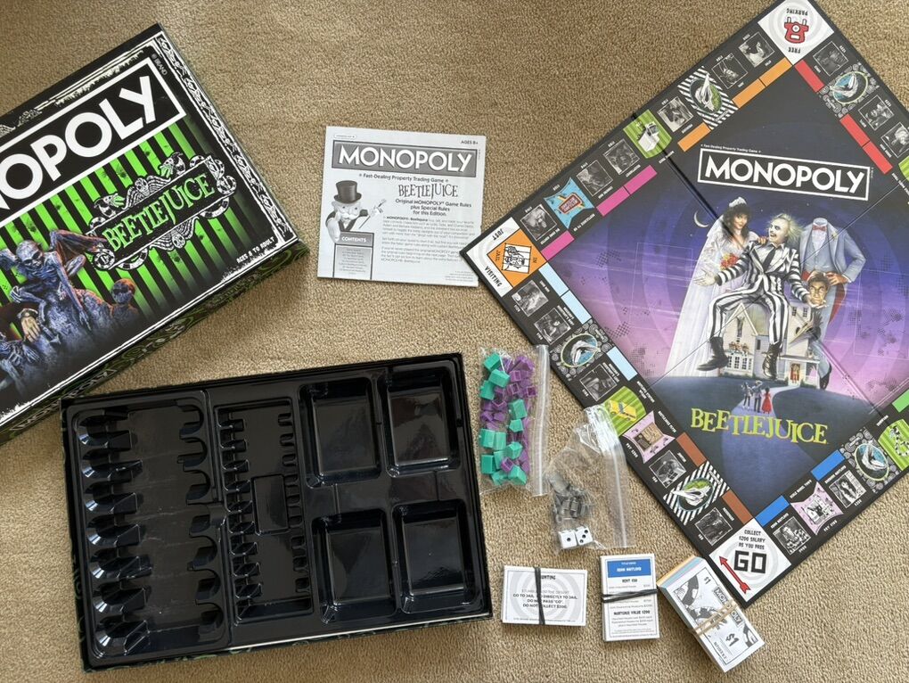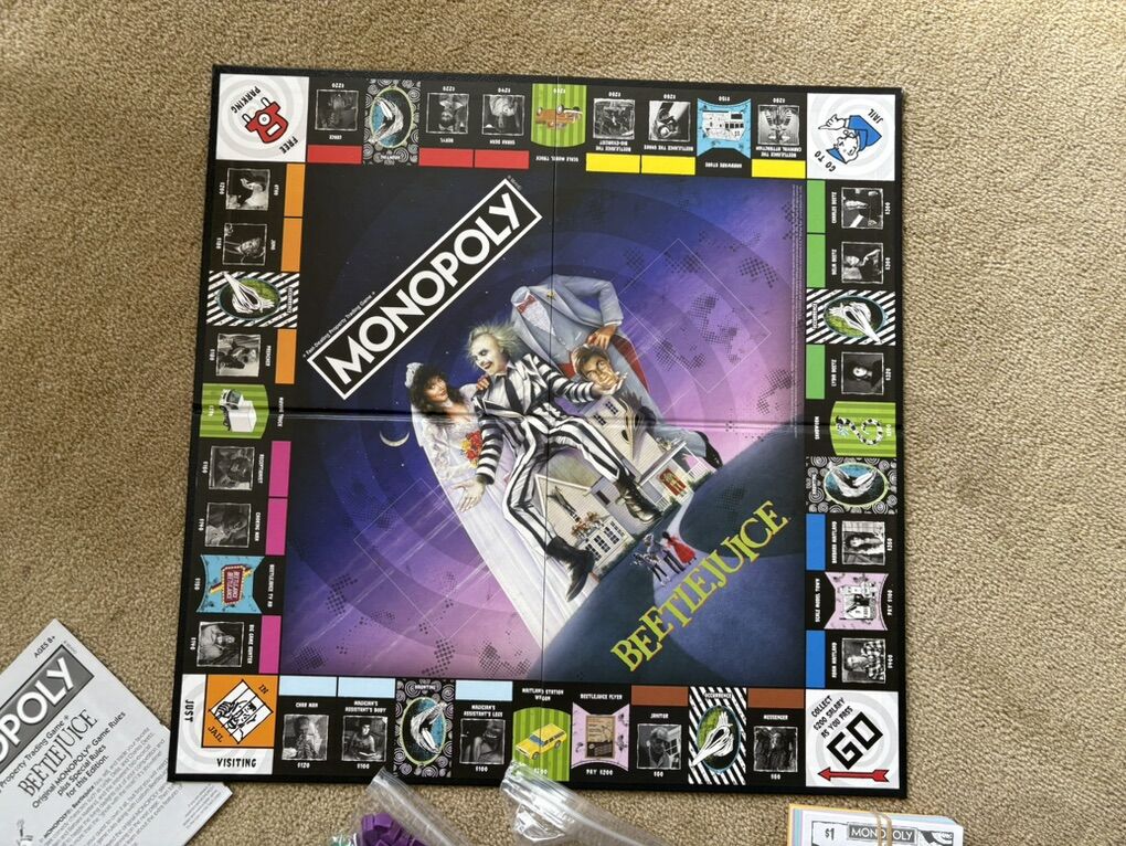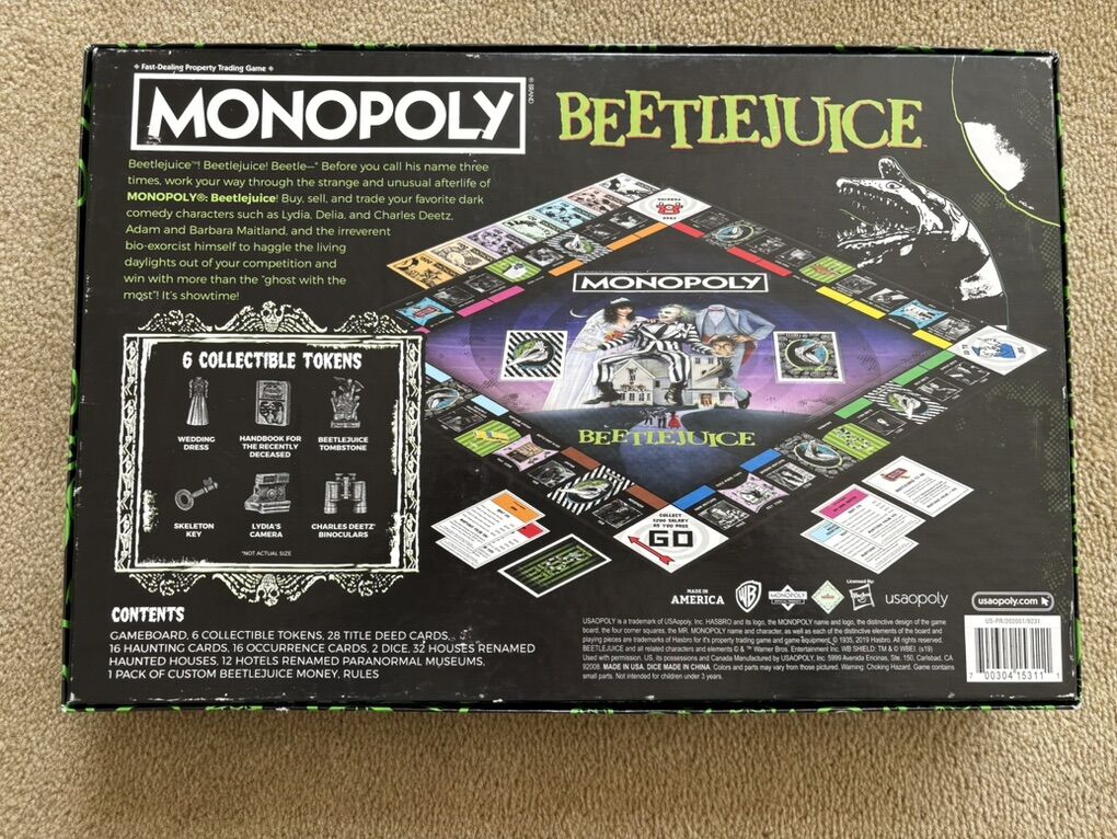 COMPLETE Monopoly: Beetlejuice Edition. Work your way through the strange afterlife of Monopoly Beetlejuice! Fast-dealing property trading game. 2-6 players, ages 8+. USAopoly, Hasbro, 2019. Complete, no missing pieces. Excellent condition (a few slight scuffs on box). Text only. Cash or Venmo.