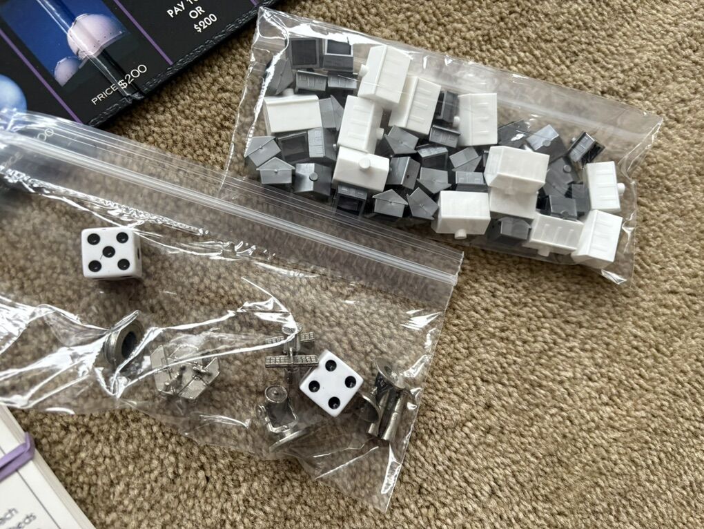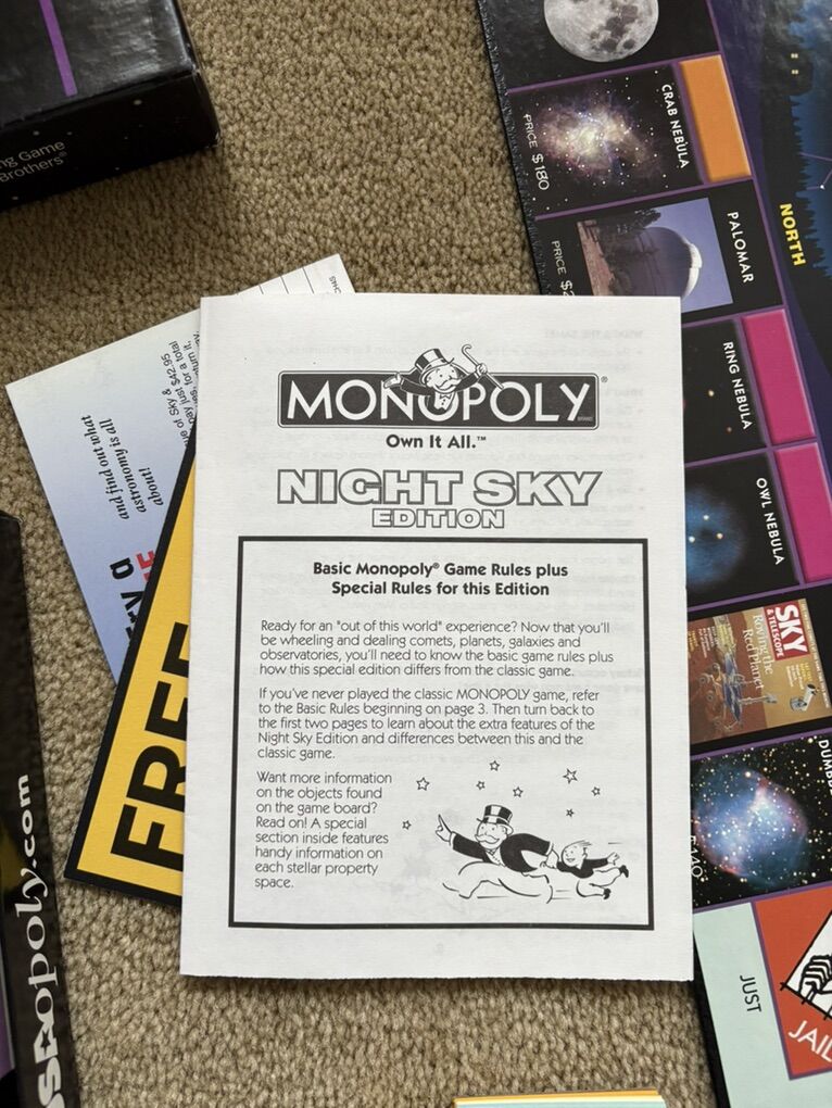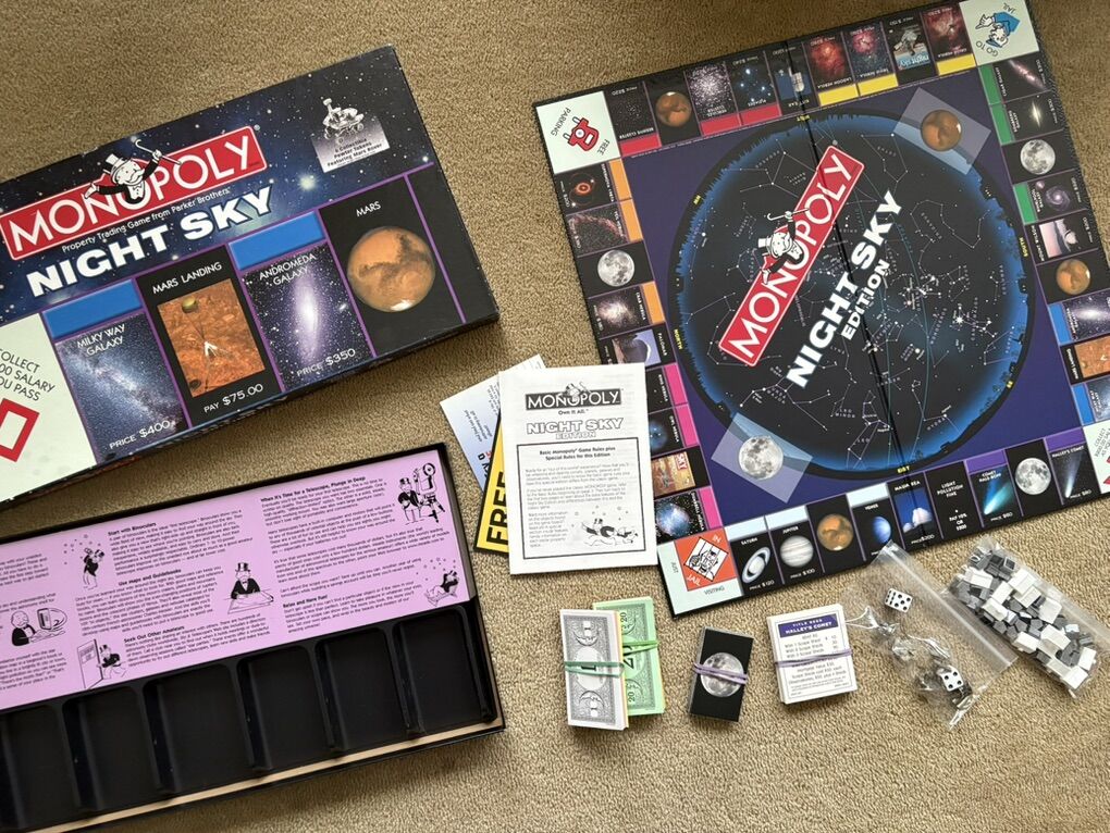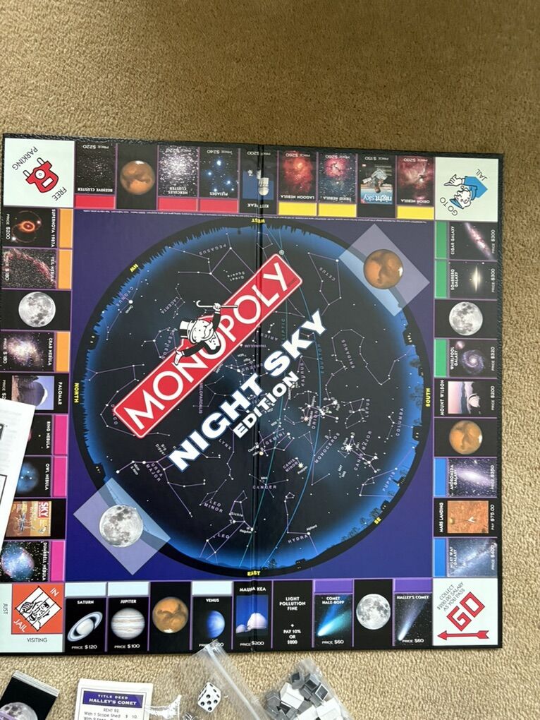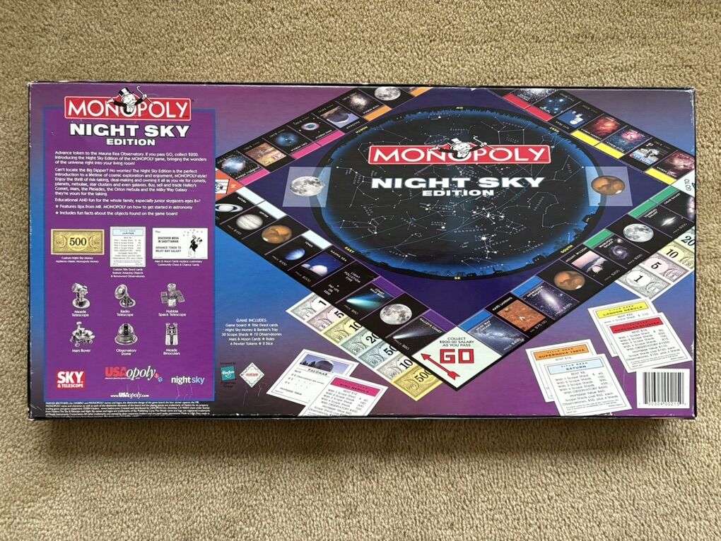 COMPLETE Monopoly: Night Sky Edition. Educational and fun for the whole family! Property trading game from Parker Brothers. USAopoly, Hasbro, 2004. Ages 8+, 2-6 players. 6 collectible pewter tokens, featuring Mars Rover. Complete, no missing pieces. Excellent condition (box corners slightly worn). Text only. Cash or Venmo.