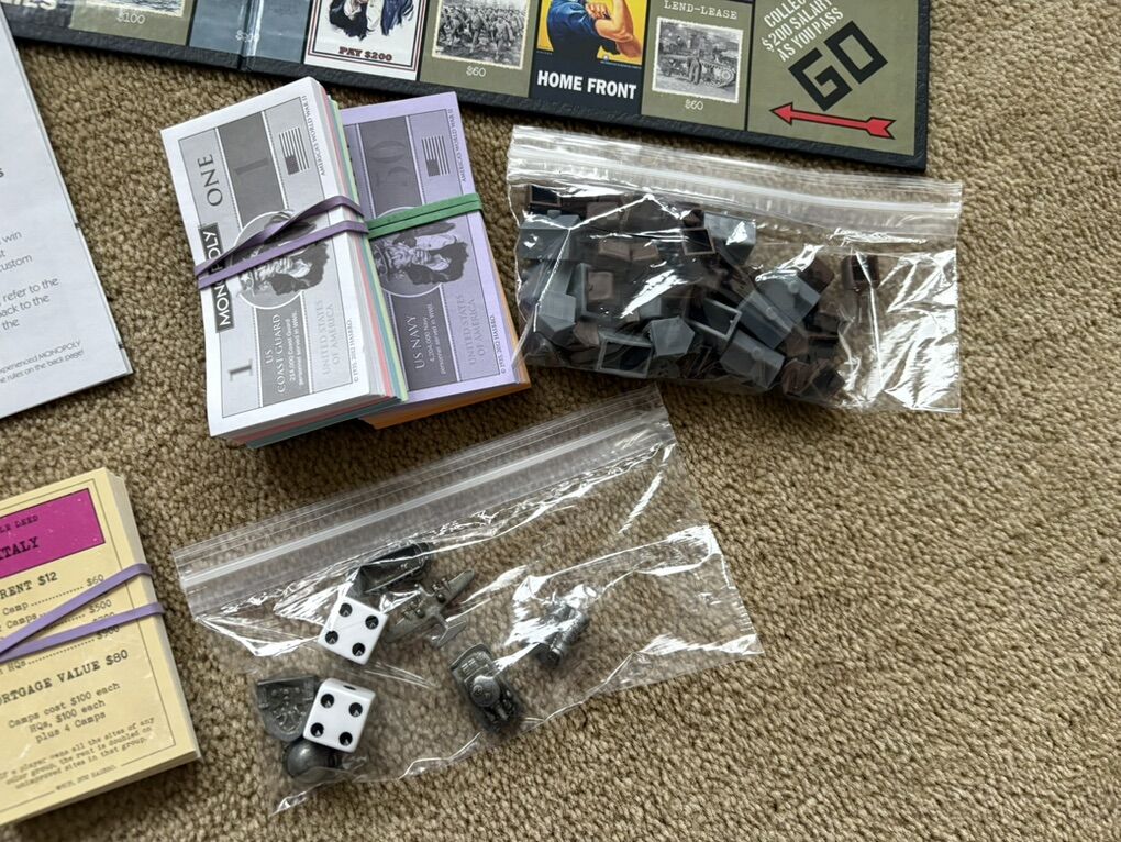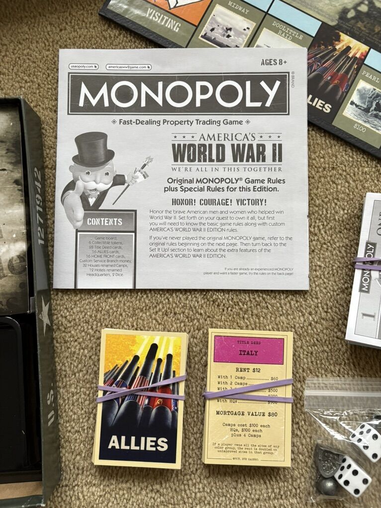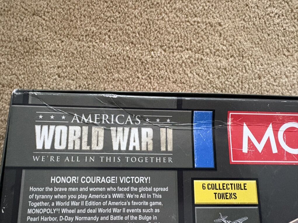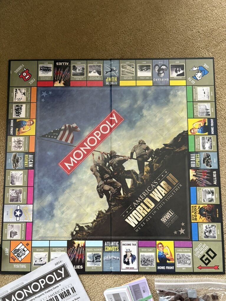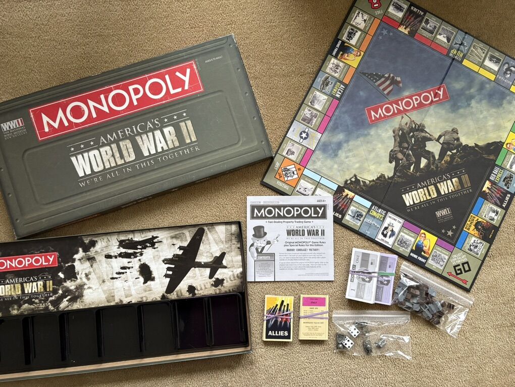 COMPLETE Monopoly: America’s World War II Edition. We’re all in this together. The National WWII Museum, New Orleans. 2-6 players, ages 8+. USAopoly, Hasbro, 2012. 6 collectible tokens. Complete, no missing pieces. Very good condition (a few slight scuffs and dents on box). Text only. Cash or Venmo.