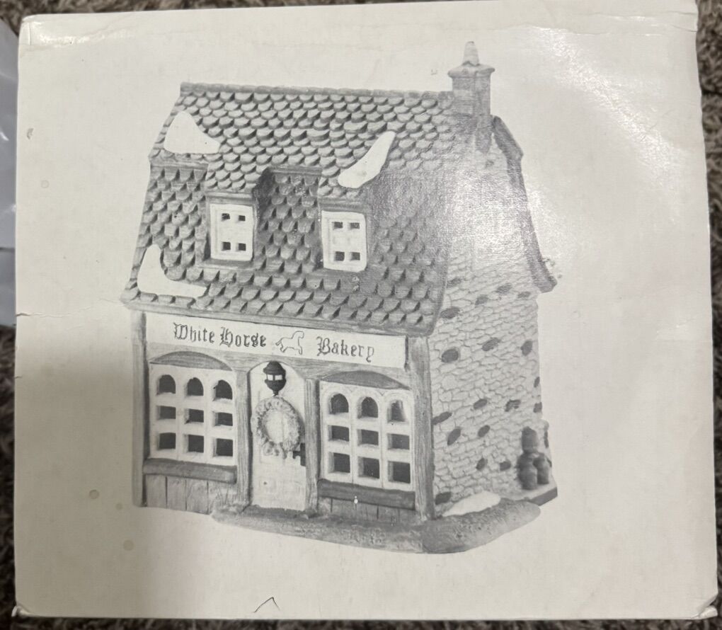 White Horse Bakery from the Dickens Village series. Department 56. Hand painted Porcelain light up house. Has cord with light, and works.