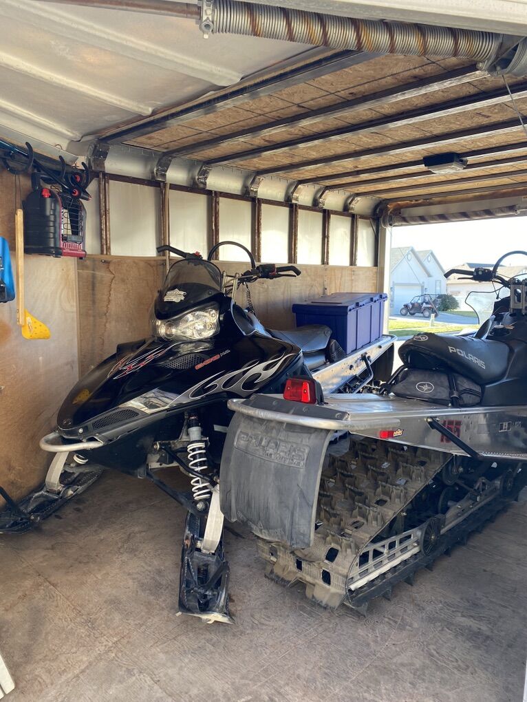 Amazing trailer! Practically brand new. Selling because i got a bigger trailer. No rust just an all around great snowmobile trailer. Double ramp doors in the front for easy unloading and loading 3 heavy duty locks Door was just redone. It’s brand new with 2 locks. Tires are in great shape and it comes with a spare. Can fit 2 long track snowmobiles easy with room to spare All insulated Interior lights are awesome All lights on the outside work. Trailer is practically new off the lot so save yourself a couple grand and go with this one! I can deliver.