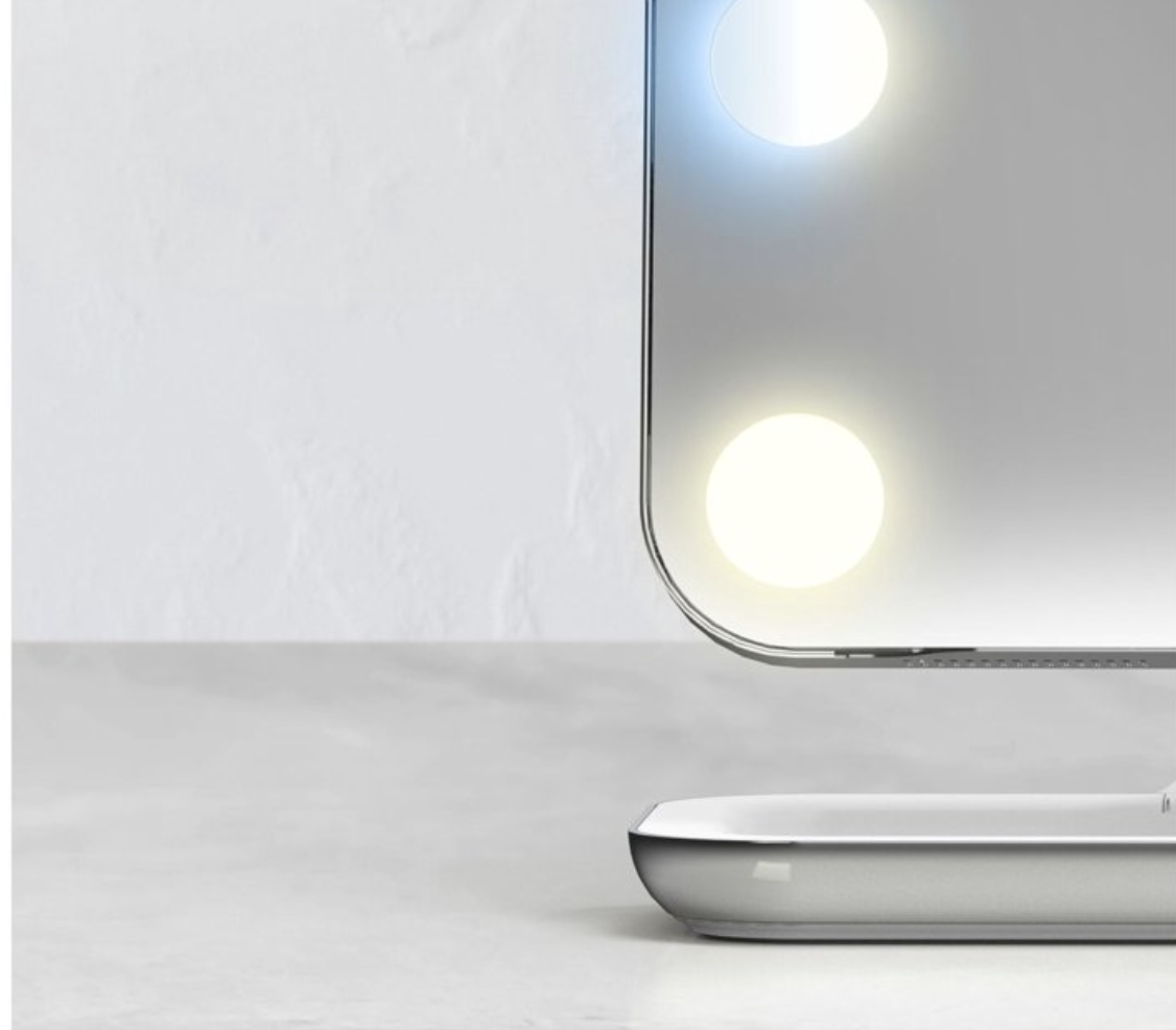 Sharper Image SpaStudio Hollywood Vanity Mirror with Fans White/Chrome. Get hair-, makeup-, and nail-ready with the SpaStudio Hollywood vanity mirror. Customize your look for any light with adjustable LED brightness and color temperatures. Two fans up top help to keep you cool while the two fans below are a quick cure for drying just-polished nails. Listen to your playlist, watch a tutorial, or charge your smartphone with the Qi wireless charging stand. From Sharper Image. Includes SpaStudio Hollywood vanity mirror and magnetic 4.75"Diam mini 10x magnification mirror Tilting design LED lights