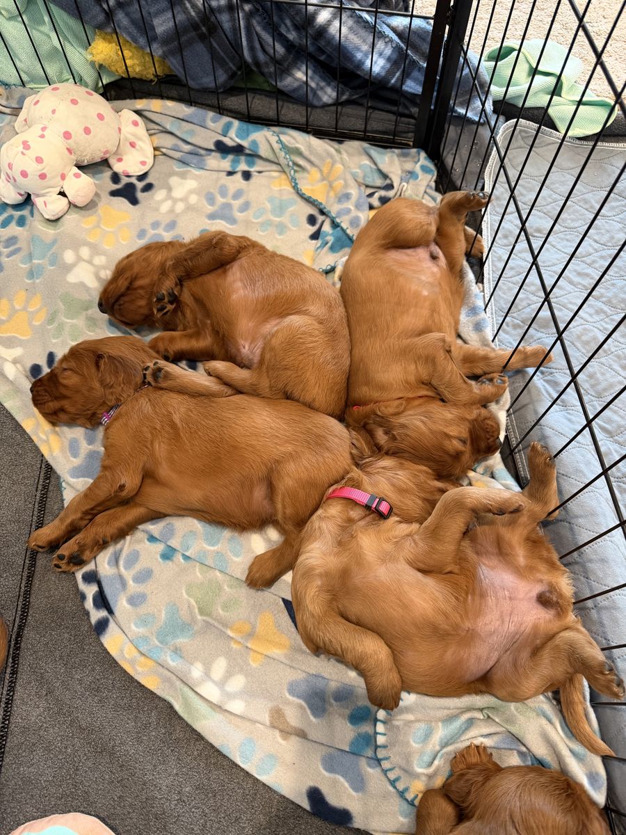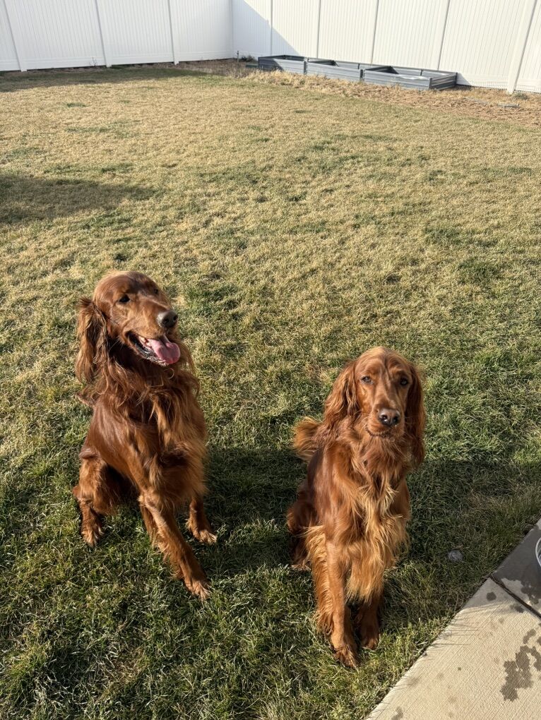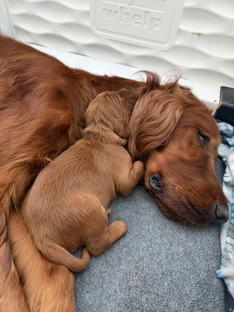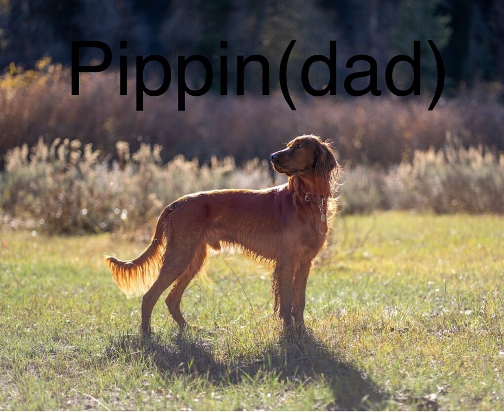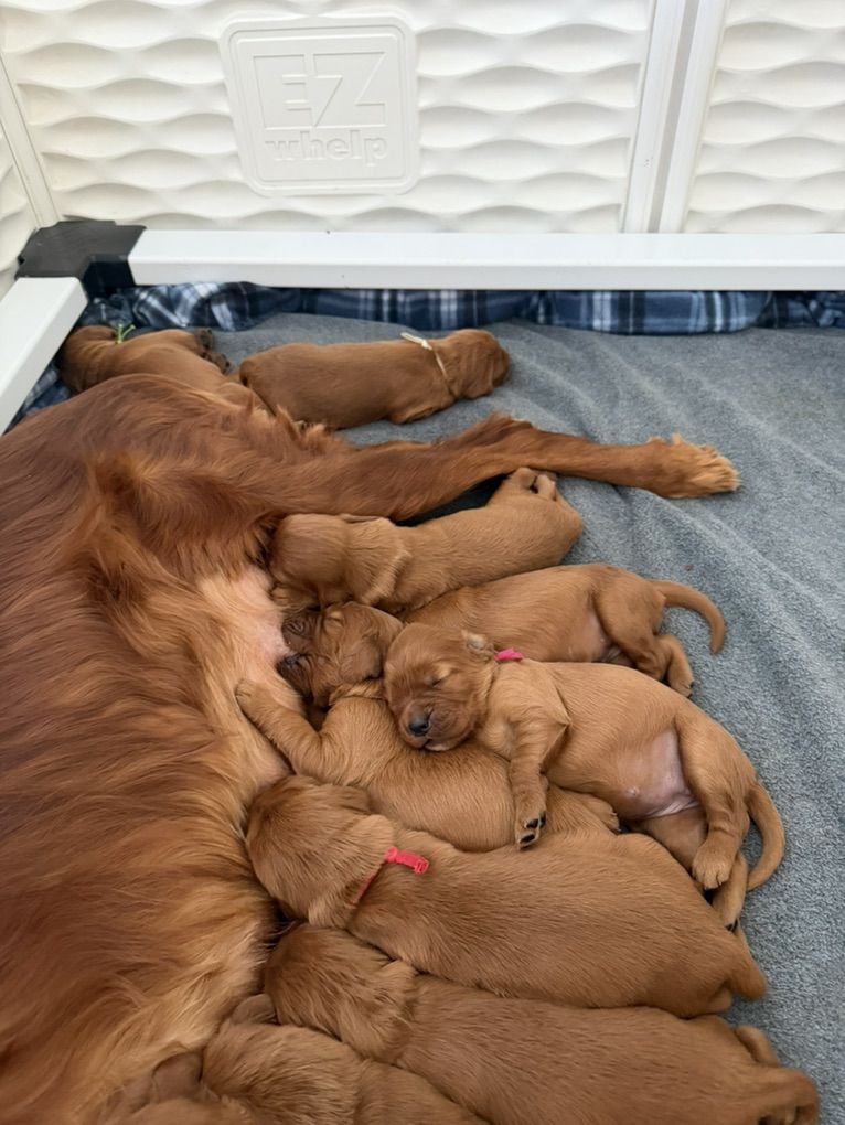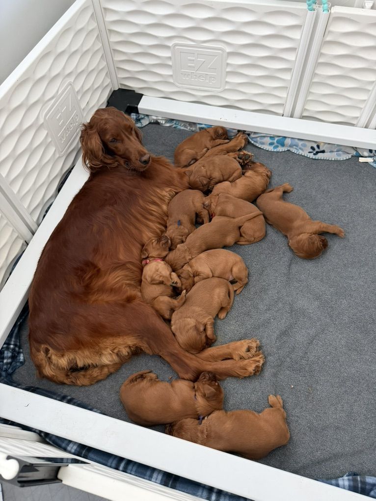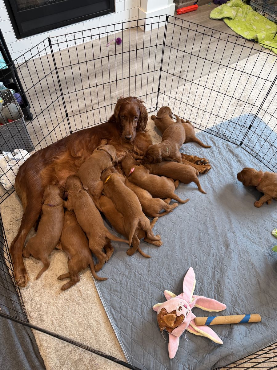 **Irish Setters need daily exercise, mental stimulation, and lots of human interaction. They do not do well as “outside only” dogs, or being alone most the day. We raise healthy, well-socialized puppies and are excited to place them in loving, prepared homes. We own the mama, Queenie, who is the most loving doggy ever. She is very submissive and patient. She is about 53 lbs. Pippin is the stud dad and he is so handsome and the biggest snuggle baby! He just wants to be held, loved, and played with. He’s about 66 lbs. *THIS IS PIPPIN AND QUEENIE’S LAST LITTER