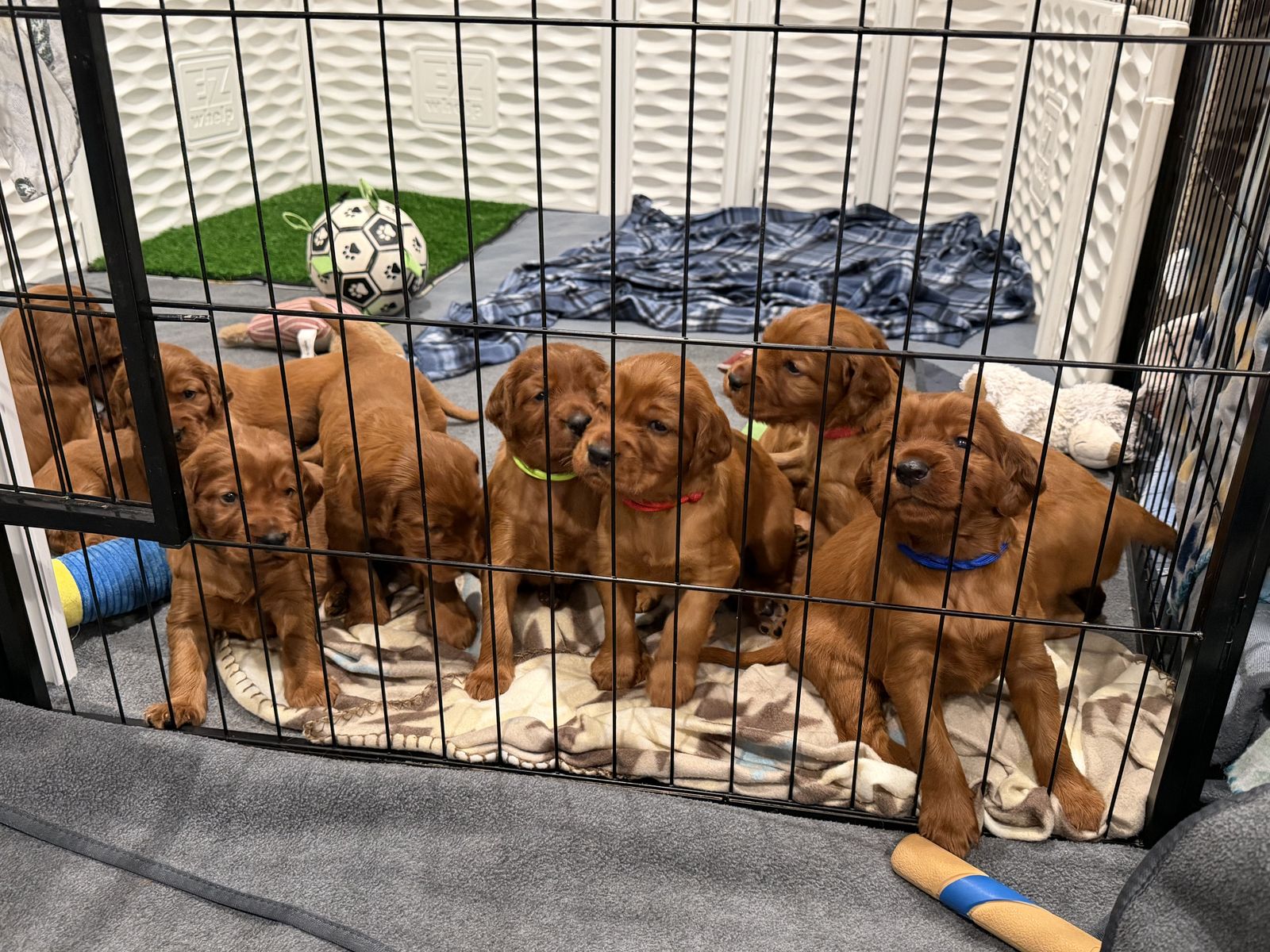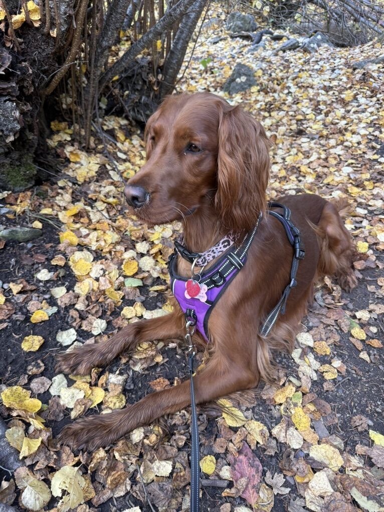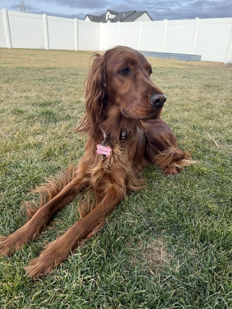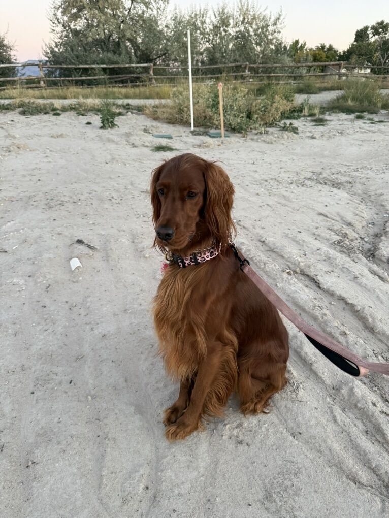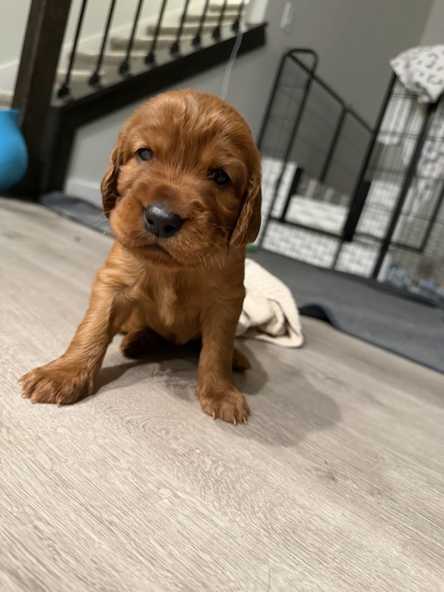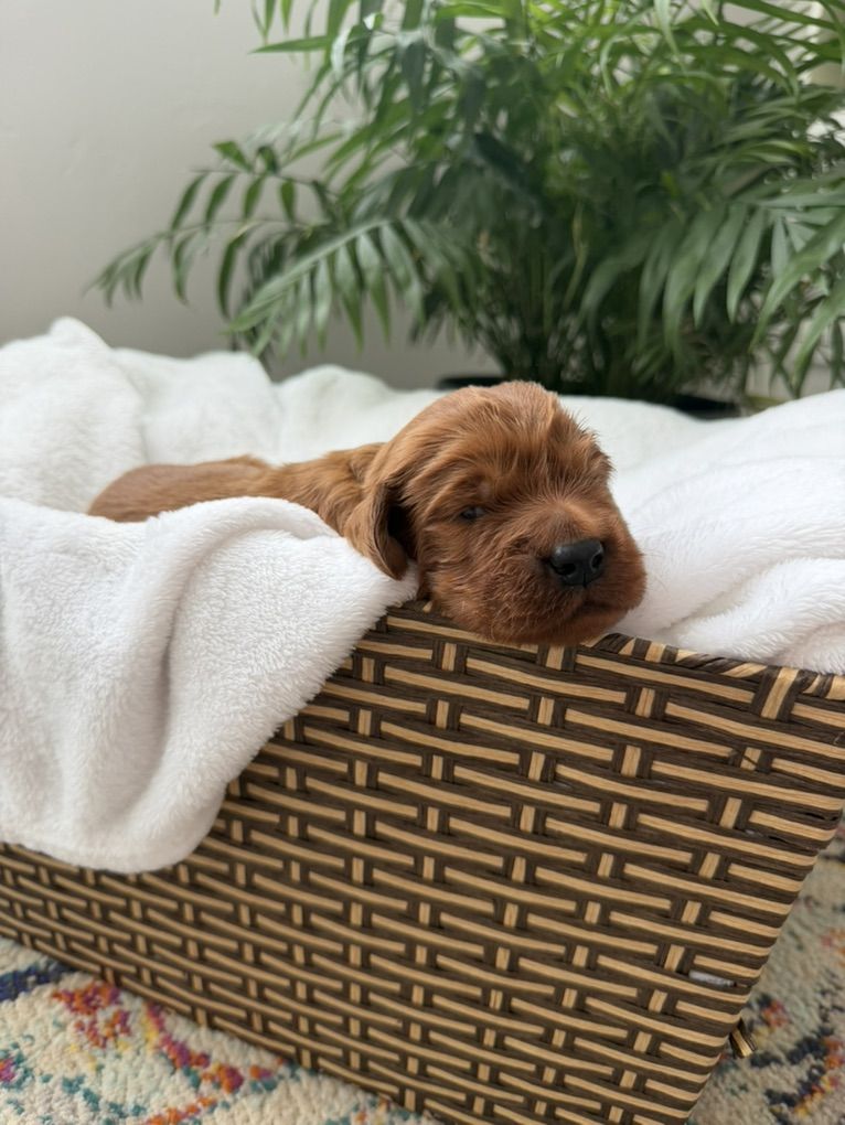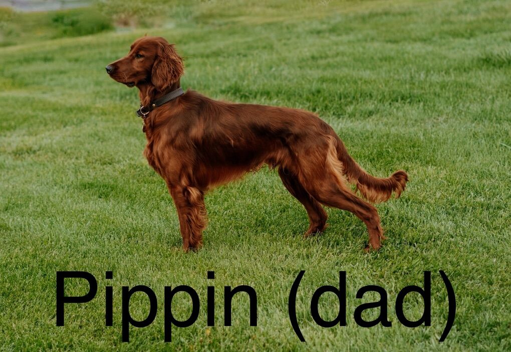 **Irish Setters need daily exercise, mental stimulation, and lots of human interaction. They do not do well as “outside only” dogs, or being alone most the day. We raise healthy, well-socialized puppies and are excited to place them in loving, prepared homes. We own the mama, Queenie, who is the most loving doggy ever. She is very submissive and patient. She is about 53 lbs. Pippin is the stud dad and he is so handsome and the biggest snuggle baby! He just wants to be held, loved, and played with. He’s about 66 lbs. *THIS IS PIPPIN AND QUEENIE’S LAST LITTER