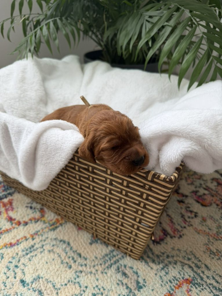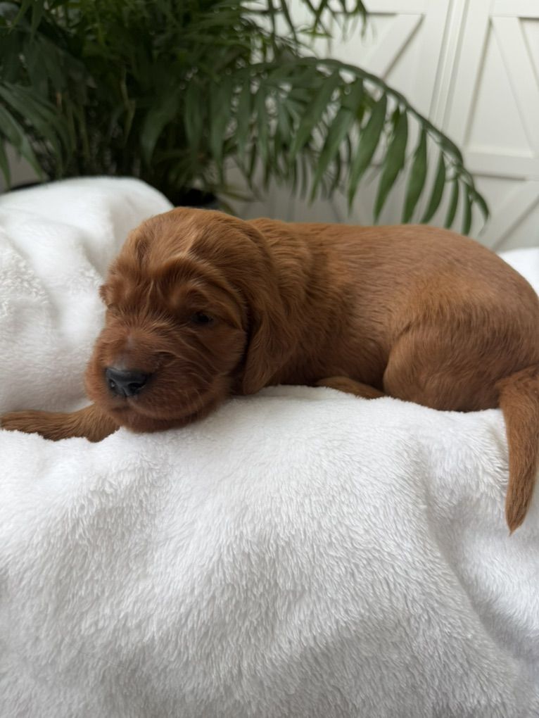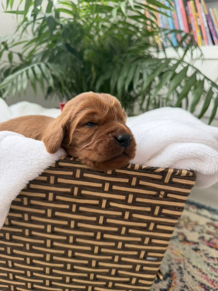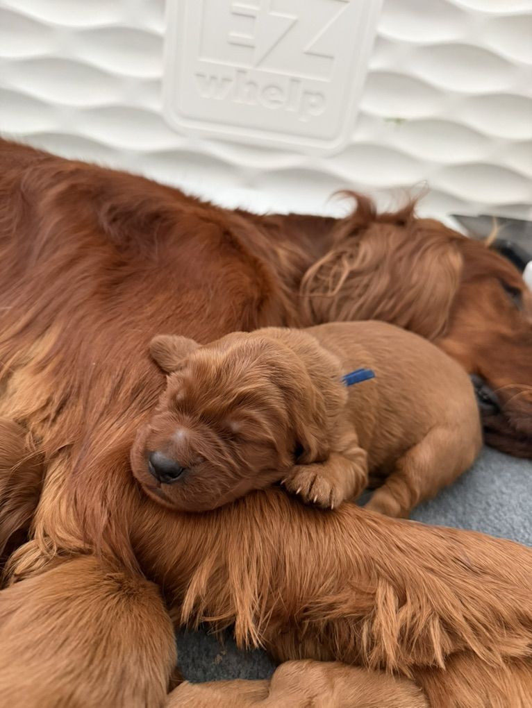 Irish Setters are amazing dogs known for their color, affection, and personalities. They are incredibly loyal, gentle with kids, highly social, and thrive as part of the family. If you’re looking for a dog that wants to be involved in everyday life then our pups are a wonderful choice! And they have less hair than double coated breeds!