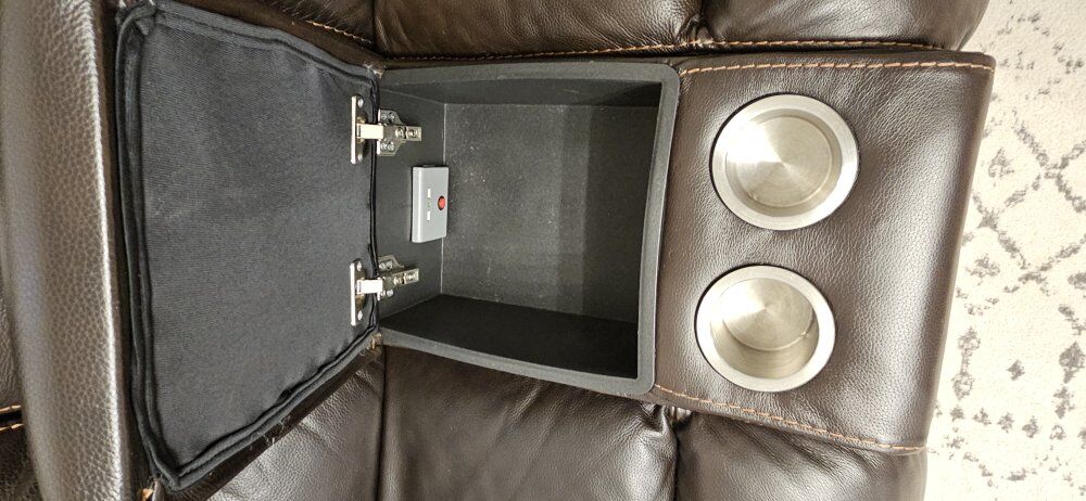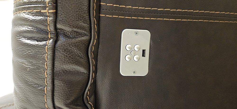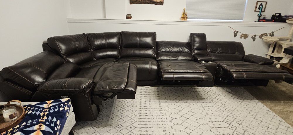 VenmoWe bought this couch from RC Willy 3 years ago, but we don't need this much couch and are looking to downsize. You can customize the configuration, moving the console or reclining sections around to fit your preferences. There are 3 reclining seats, all are powered, and all have powered, adjustable head rests. The two end sections have a USB port, and there is USB inside the console as well. All reclining seats and adjustable head rests work smoothly. Color is dark brown with lighter brown stiching details.