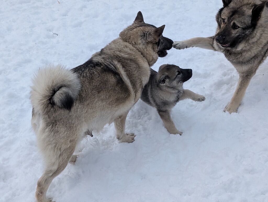 ZelleGrand Champion bloodlines, show quality and can be registered. Vet checked, dewormed and vaccinated. 9 weeks old. Raised with 4 kids and very freindly. They are great family dogs, guard dogs and hunting dogs. These puppies are partially house trained and will win your heart. Only 1 male and 3 females left. Shipping is available for about $435. Elkhounds are a bit smaller than huskies and malamutes and they are a lower energy. Makes for a very nice family dog.