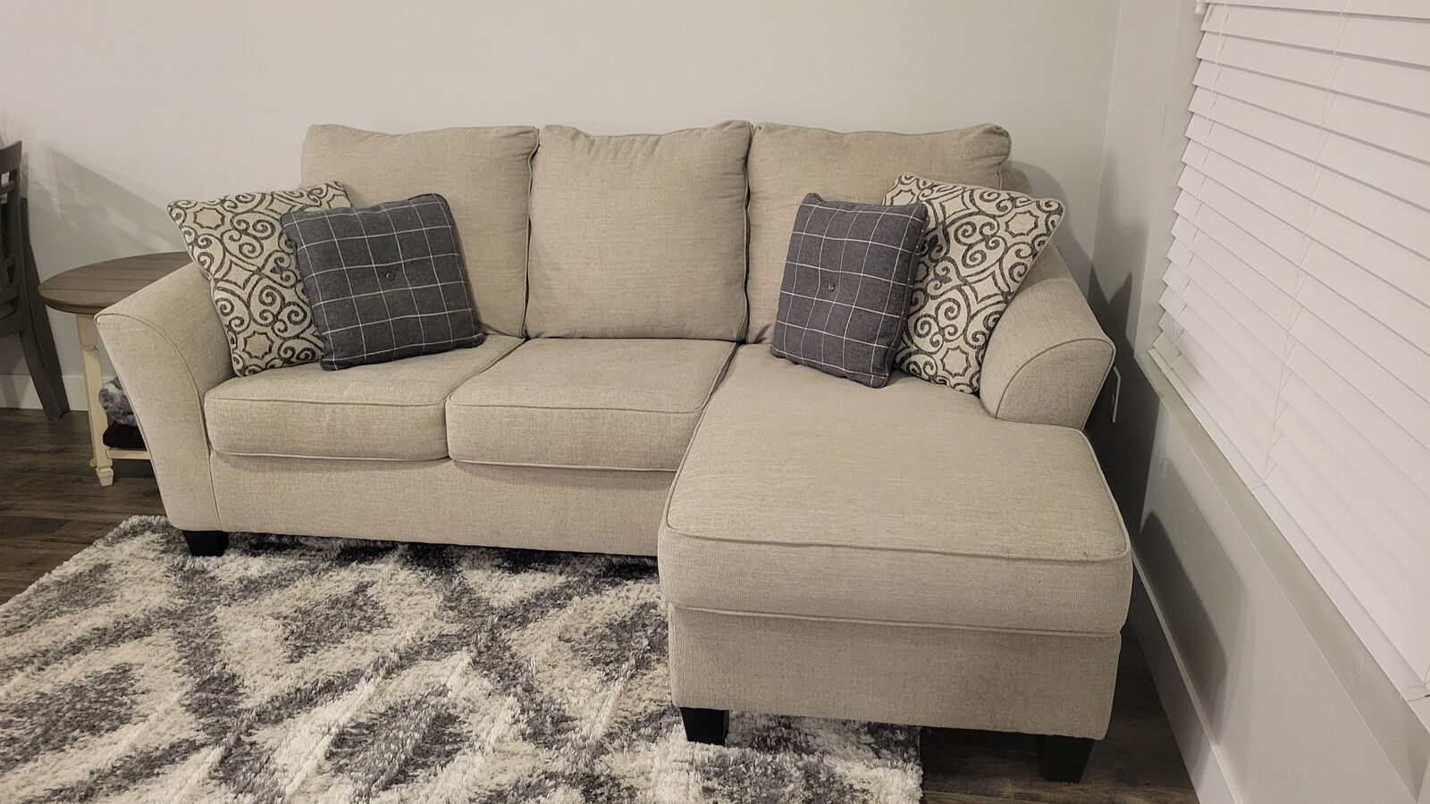 VenmoPurchased 4 years. Looking to sell for $600 or best offer. It's in decent shape. I'm moving and so am looking to sell. Pillows included. The chaise lounge can be adjusted to the left or right side of the couch.