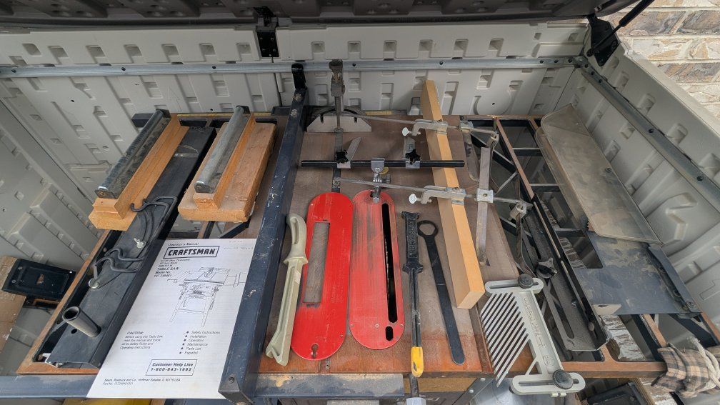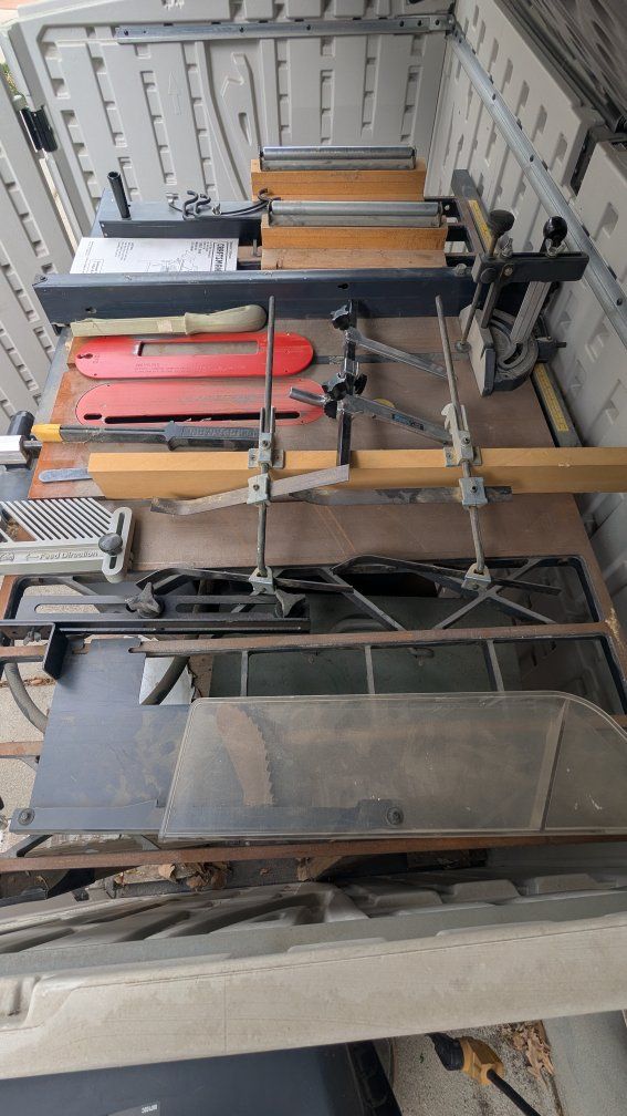VenmoSears CraftsmanTable saw with lots of extras and a wheeled base. Also, a tank vacuum to keep the area clean.