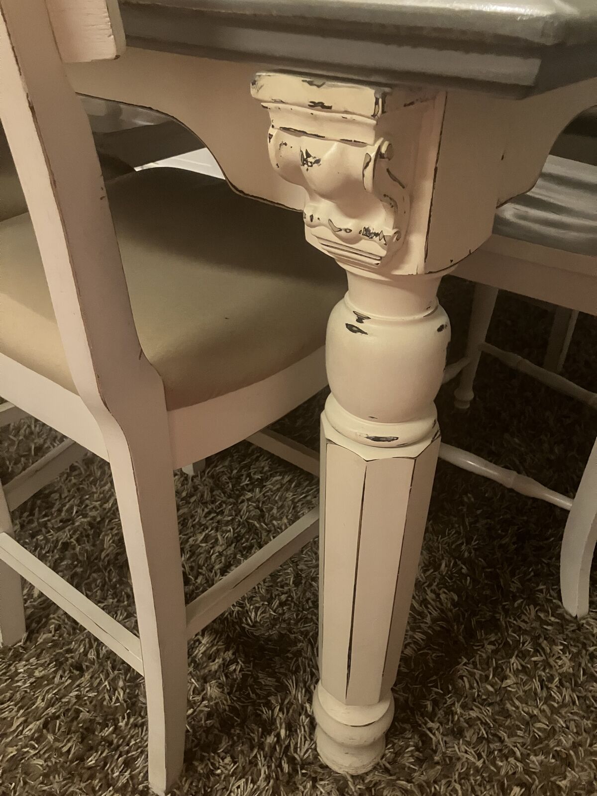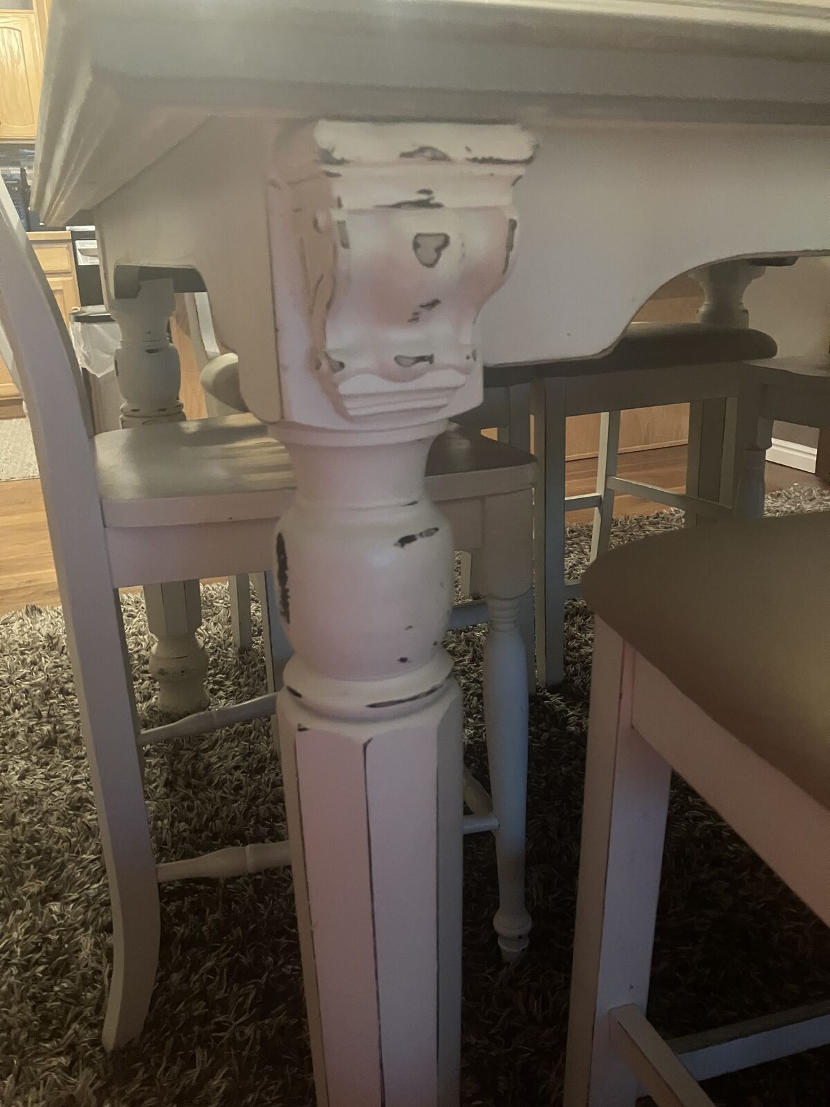 Chairs are slightly more distressed than the table, but the set matches very well.