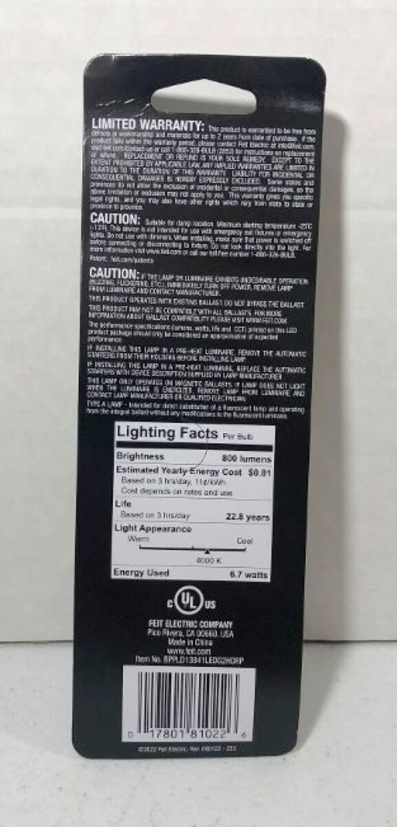 Upgrade your existing 13W PL fixtures to advanced LED energy-saving technology with the Feit Electric BPPLD13841LEDG2HDRP Double Twin Tube LED Bulb. This 2-pin LED bulb has an output of 800 lumens and a 4000K Cool White light, ideal for general purpose and task lighting. It uses only 6.7 watts of electricity -- up to 48.5% less than equivalent 13-watt fluorescent bulbs. Feit Electric Quad Tube PL replacements keep cool regardless of atmosphere, giving them an average life span of 25,000/22.8 years. They are RoHS compliant and are 100% mercury free. Installation is easy: no replacement of the ballast or installation of LED driver required. The estimated energy cost is only $0.81/year. Choose a dependable, general-purpose light bulb for residential or commercial applications by choosing Feit Electric.
