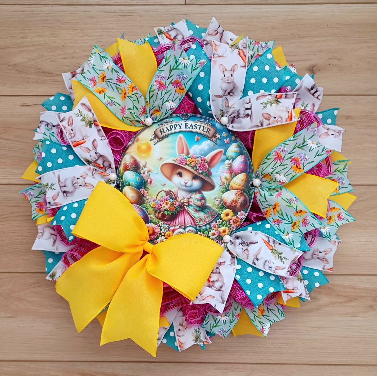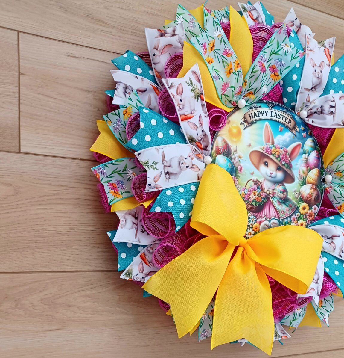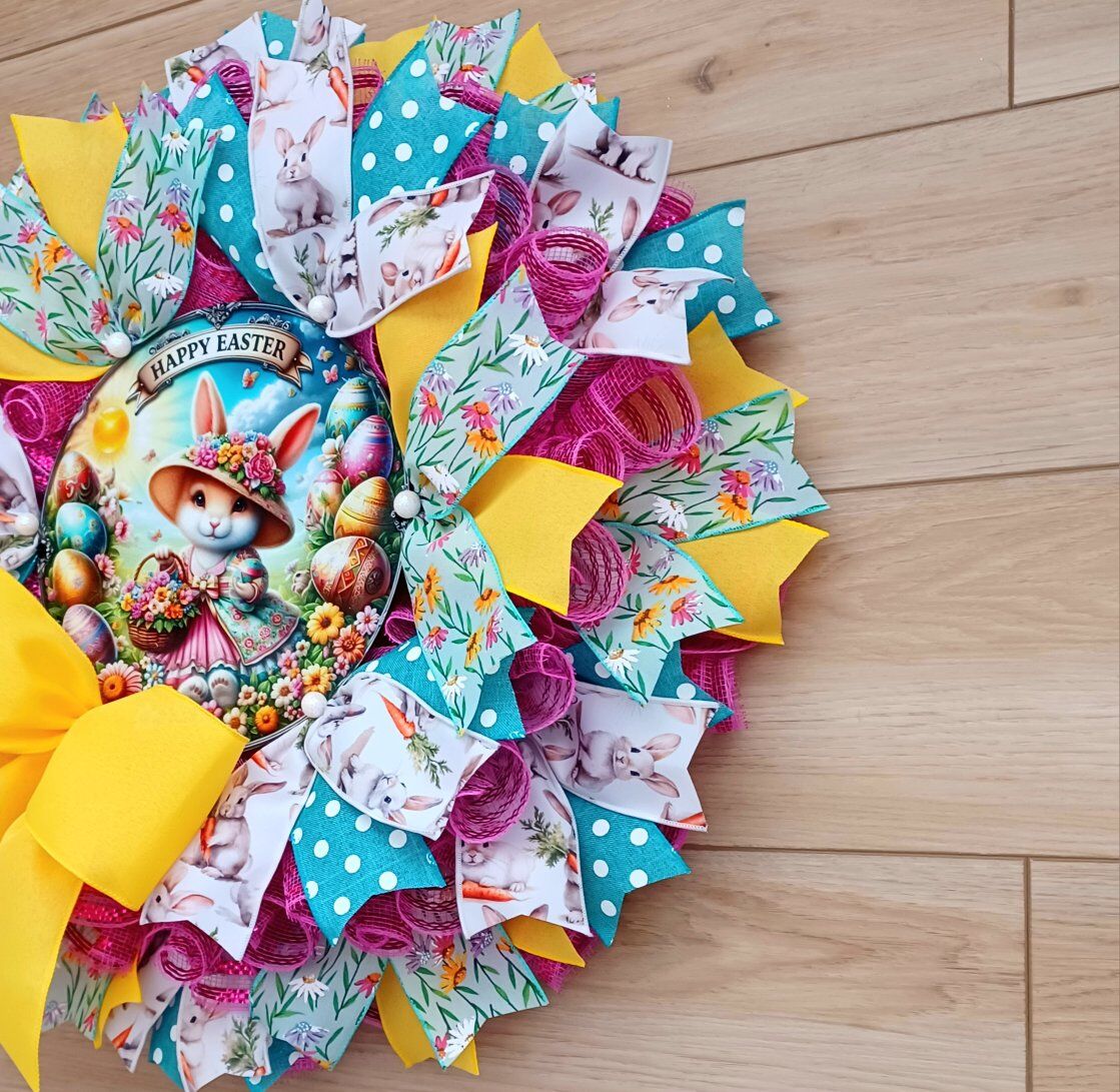 Stunning 24" Easter wreath for sale featuring a beautiful “Happy Easter” sign and a cute bunny wearing a little dress while carrying a basket full of flowers. Perfect for adding a sweet spring touch to your front door or home décor. Handmade with care, customizable to your preferences, and shipping is available. Message me if you’re interested!