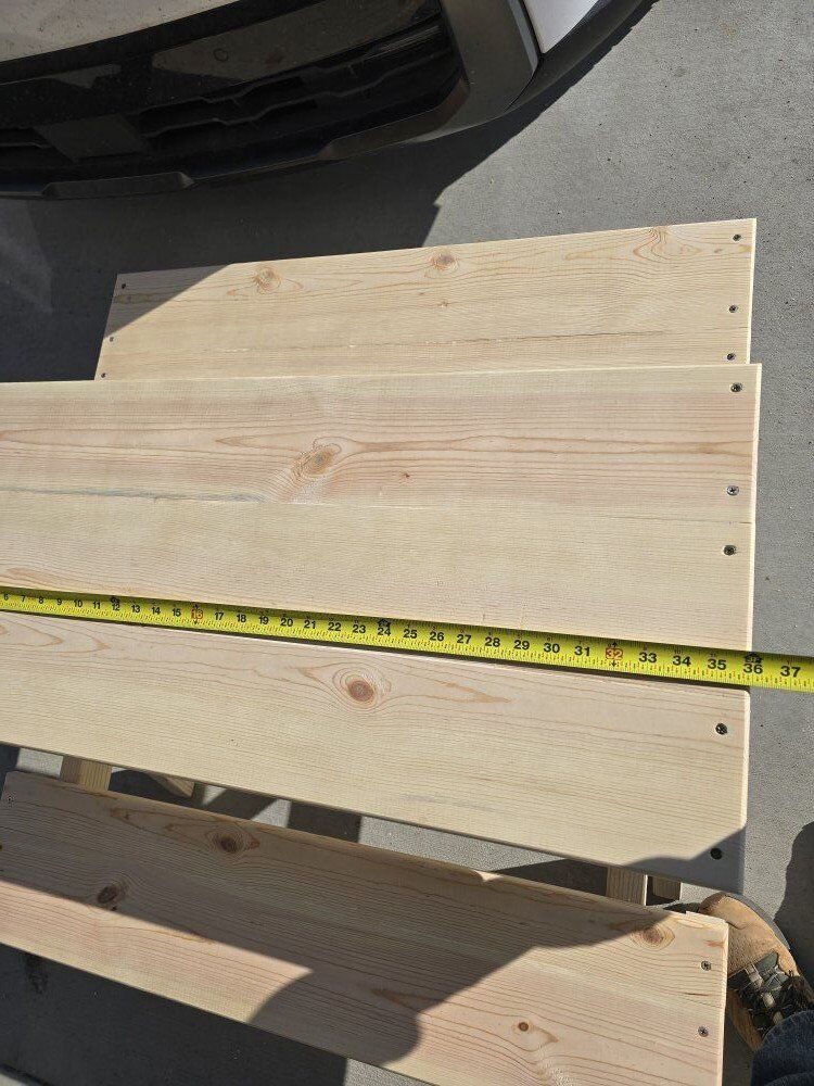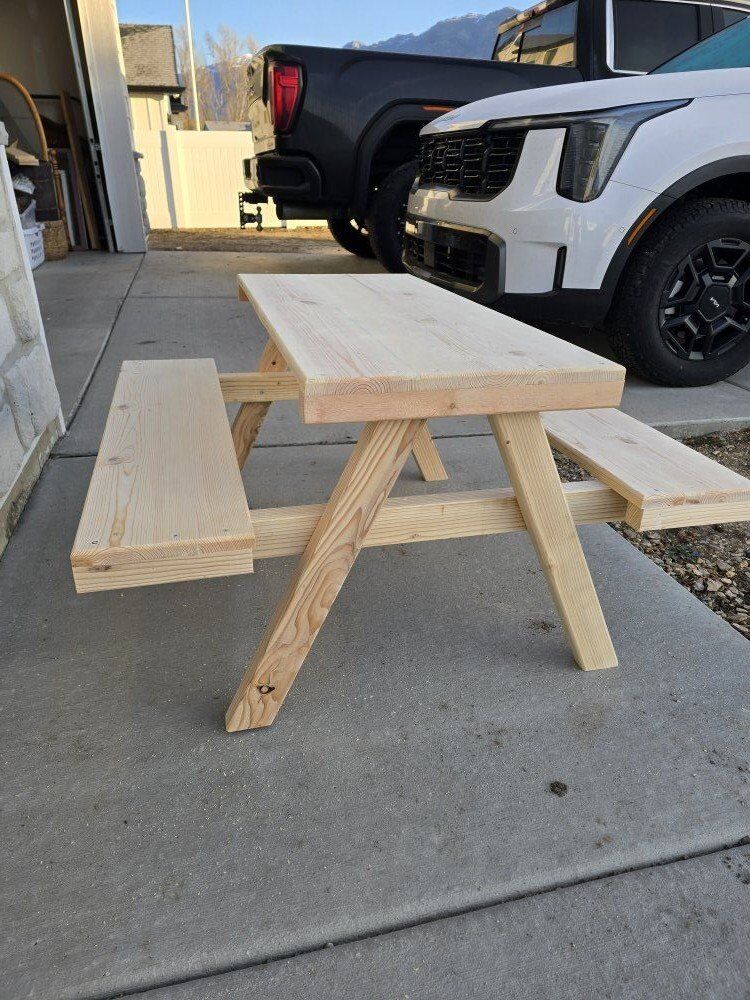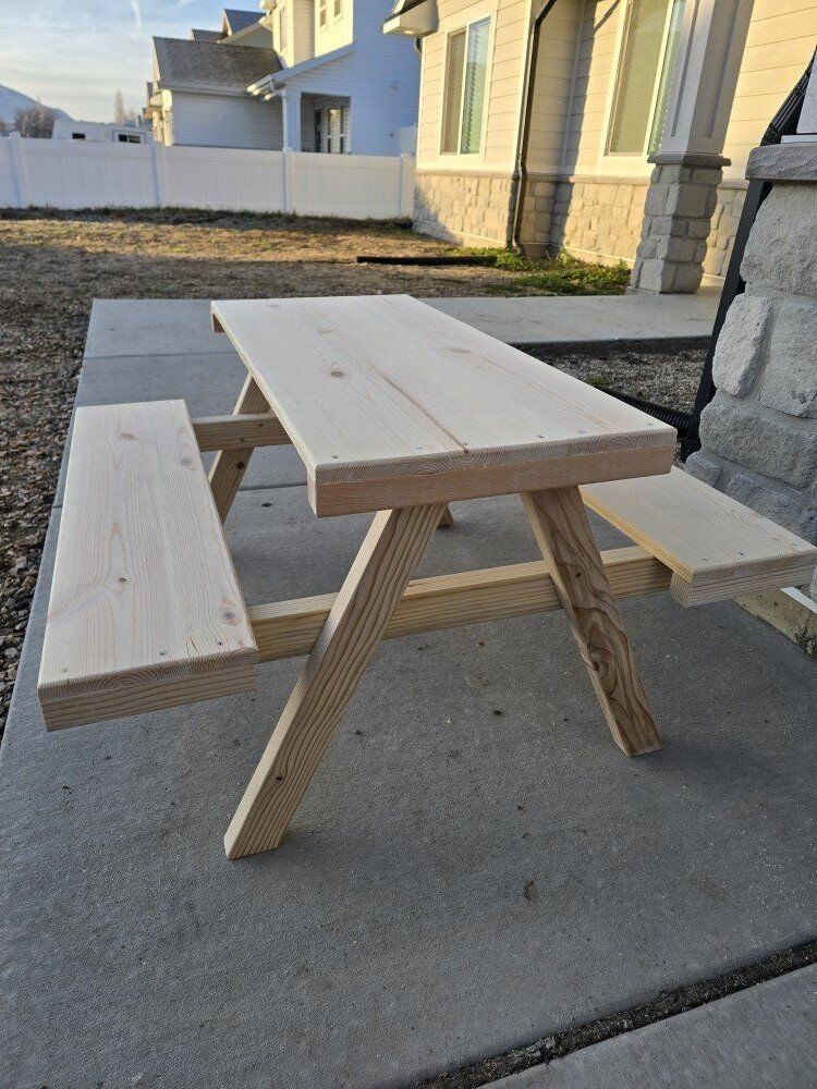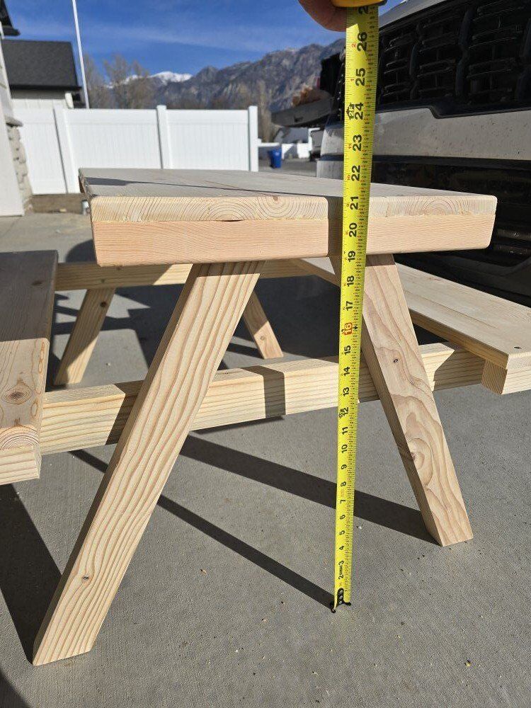Venmodimensions are 21 inches high, 36 inches long and 38 inches deep from seat to seat. table top is 16x 36. i made this for my daughter but built a larger table so she could grow in to. 75$ OBO