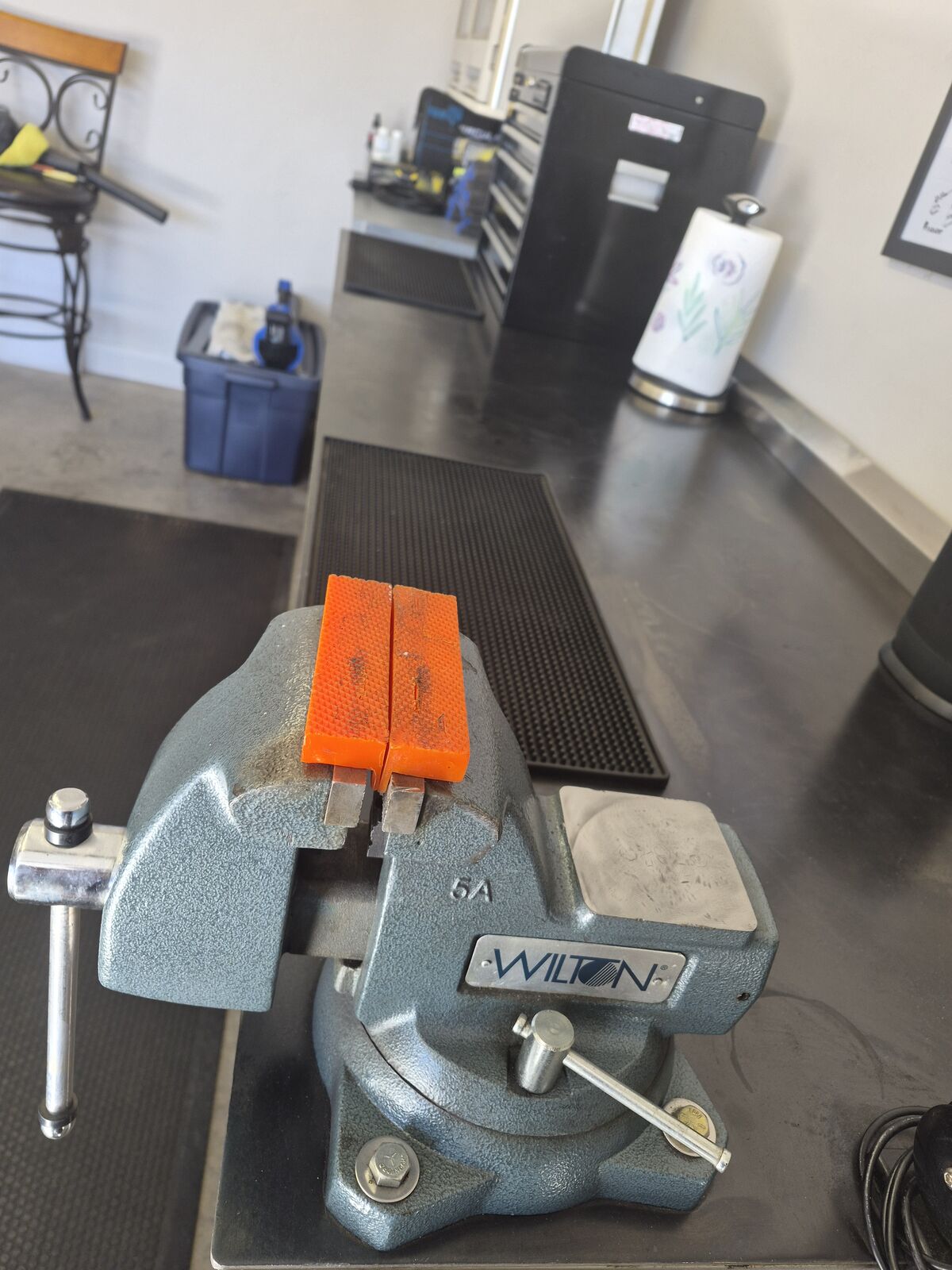 This fabrication table is stainless steel on casters with a 6-inch Wilton combination vise; enclosed, 5” jaw face; 5-1/4” max jaw opening, serrated. Custom cut quarter-inch steel plate top. I had the table custom made for my aircraft company. Extremely expensive, beautiful table. Measures 8' long x 31.5" deep x 39" tall. Had the plate sheered for a custom fit, and the high-end vise.