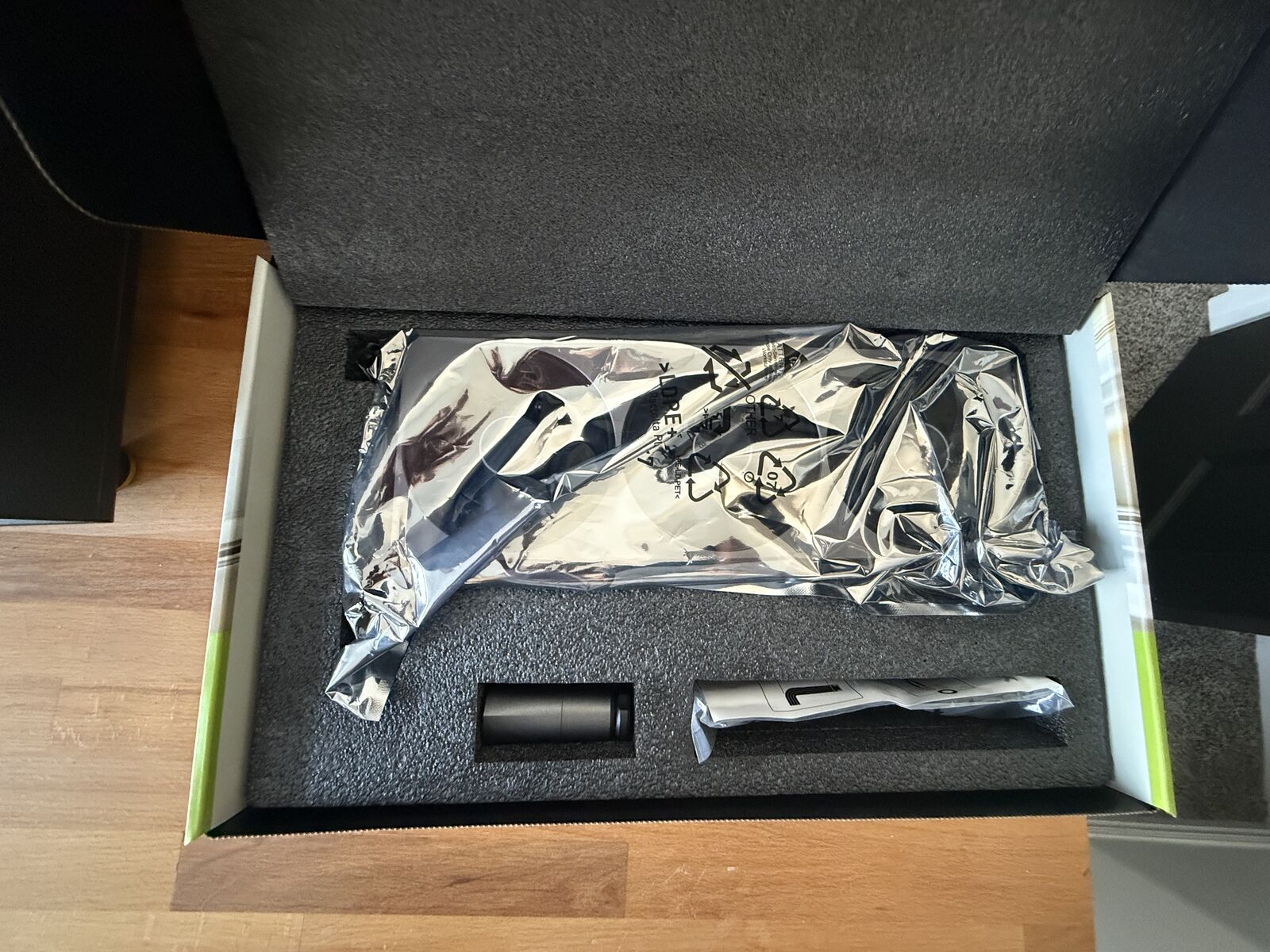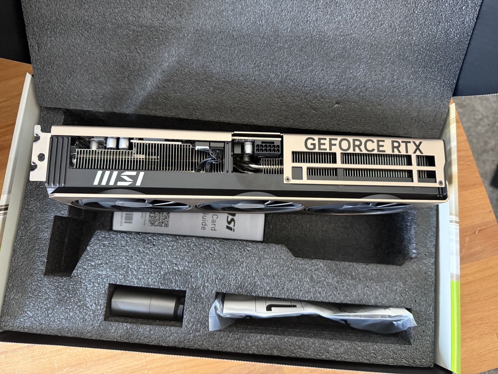 Comes with all the original pieces and parts. Power adapter ( I never used) and the GPU anti-sag bracket. Comes in the anti-static bag.
