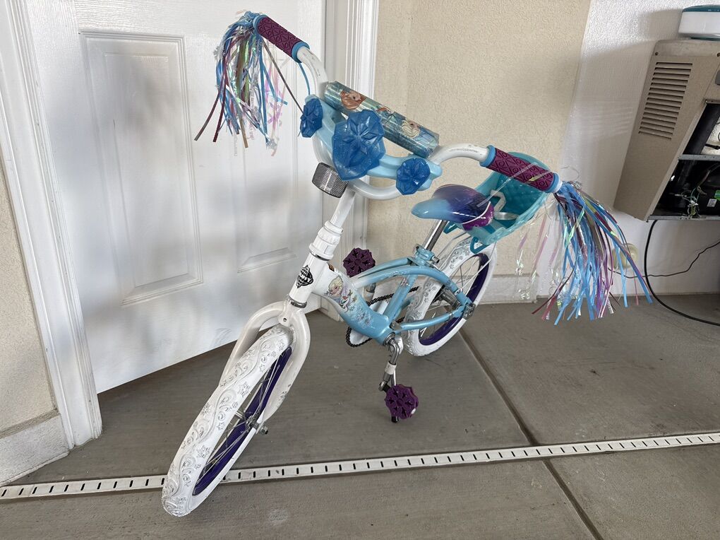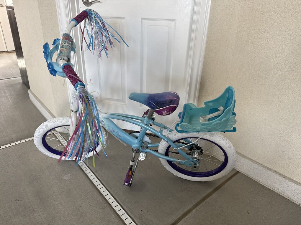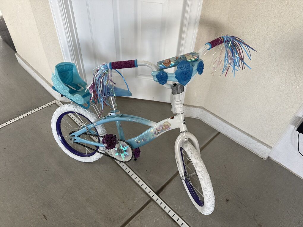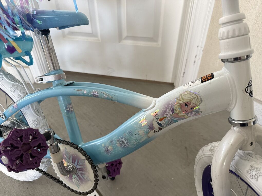 Venmo“ Frozen” princess 16 inch Girls bike made by Huffy. In near new condition. Wheels are true with great tire tread. Tires hold air no leaks. Has rear coaster brakes that work great, carrying basket on rear for doll!!!