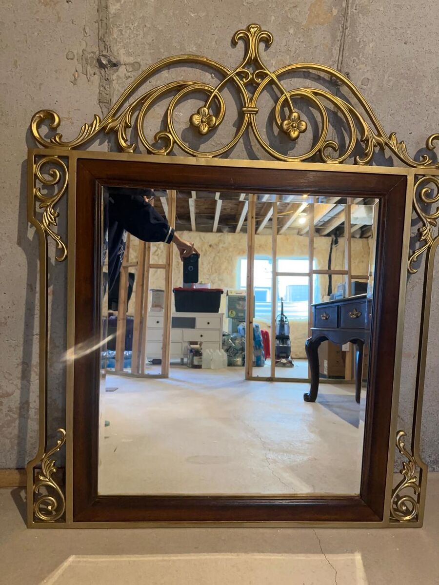 ZelleSelling a beautiful large and heavy decorative wall mirror featuring an ornate gold-tone metal design paired with a rich wood frame. A classic statement piece that works perfectly in an entryway, living room, bedroom, or above a console or dresser.