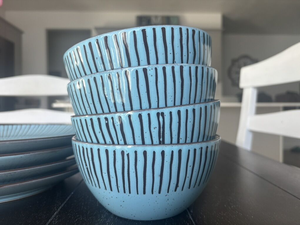 VenmoBeautiful discontinued blue and black dinnerware set in a modern striped design. This is a full matching 12 piece set and is in excellent condition with no chips, cracks, or damage.
