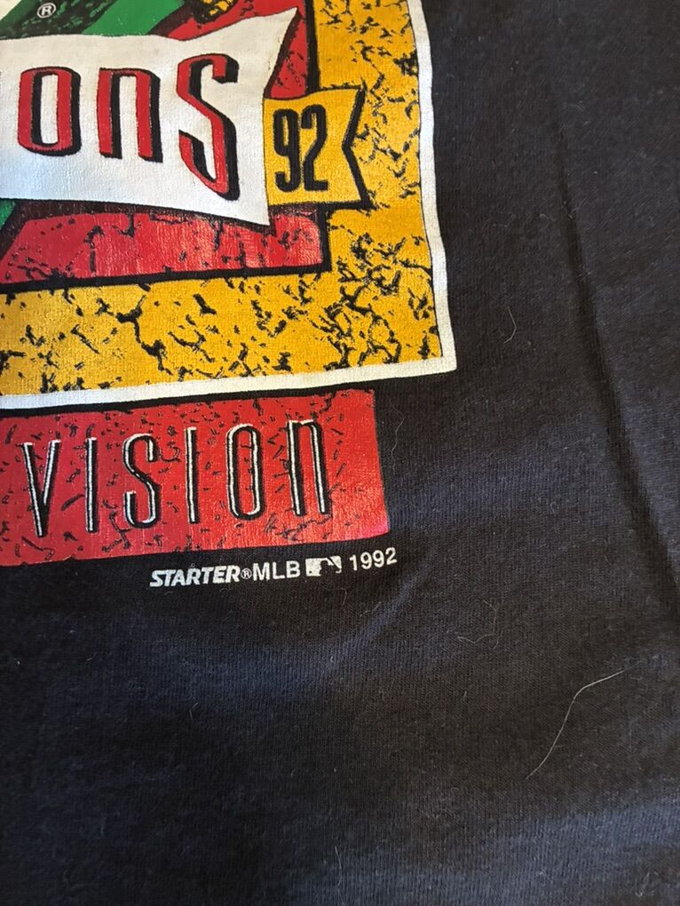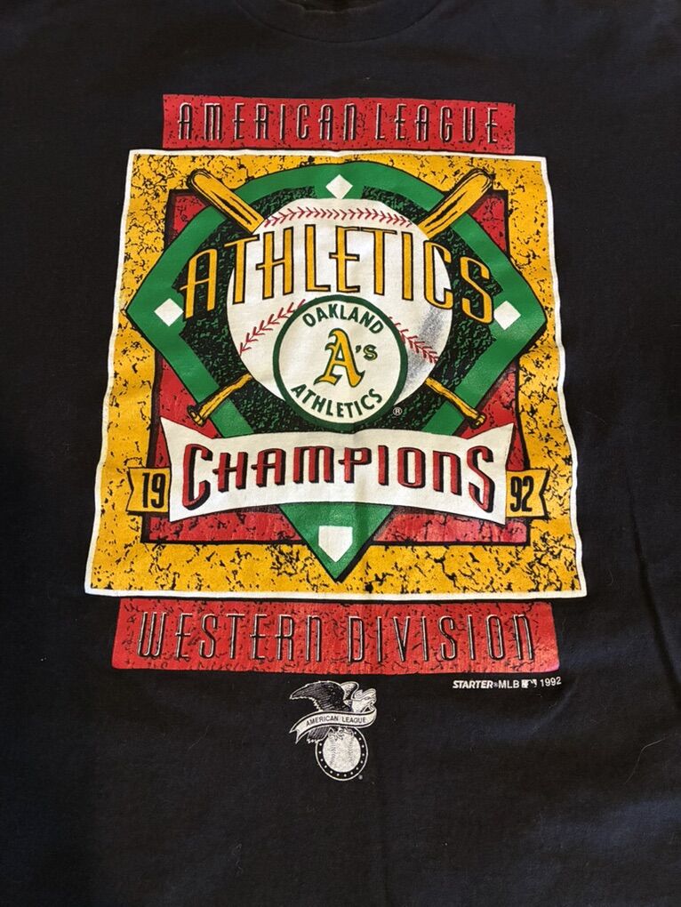 This product is a vintage Oakland Athletics T-shirt from 1992, featuring the Starter tag on it. It is size XL and designed for men. The shirt celebrates the Major League Baseball championship victory of the Oakland Athletics in 1992. Perfect for fans of the team or collectors of MLB memorabilia, this shirt is a nostalgic piece of sports history.