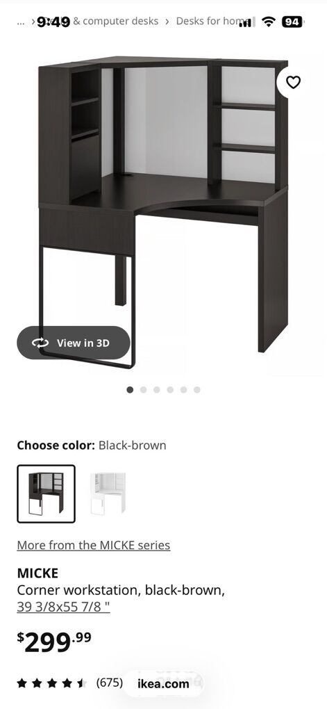 VenmoIKEA Micke Black/Brown corner desk. Used,, some scratches. Picture shows what it looks like constructed. It is currently taken apart in a few pieces to get it out the door.