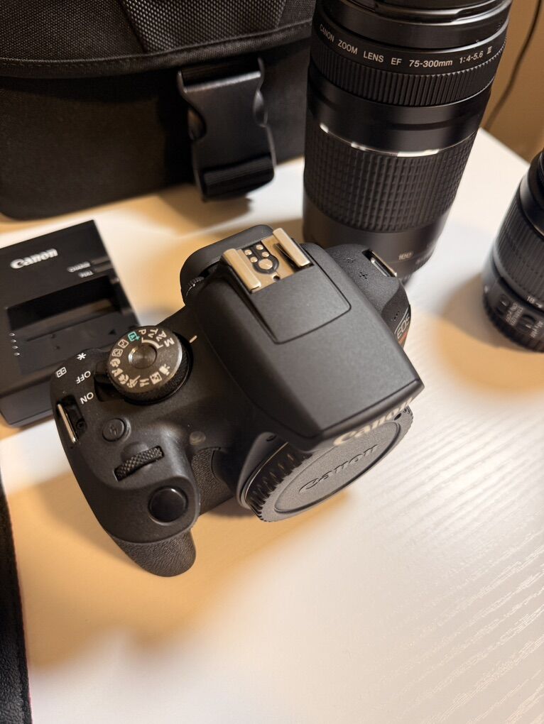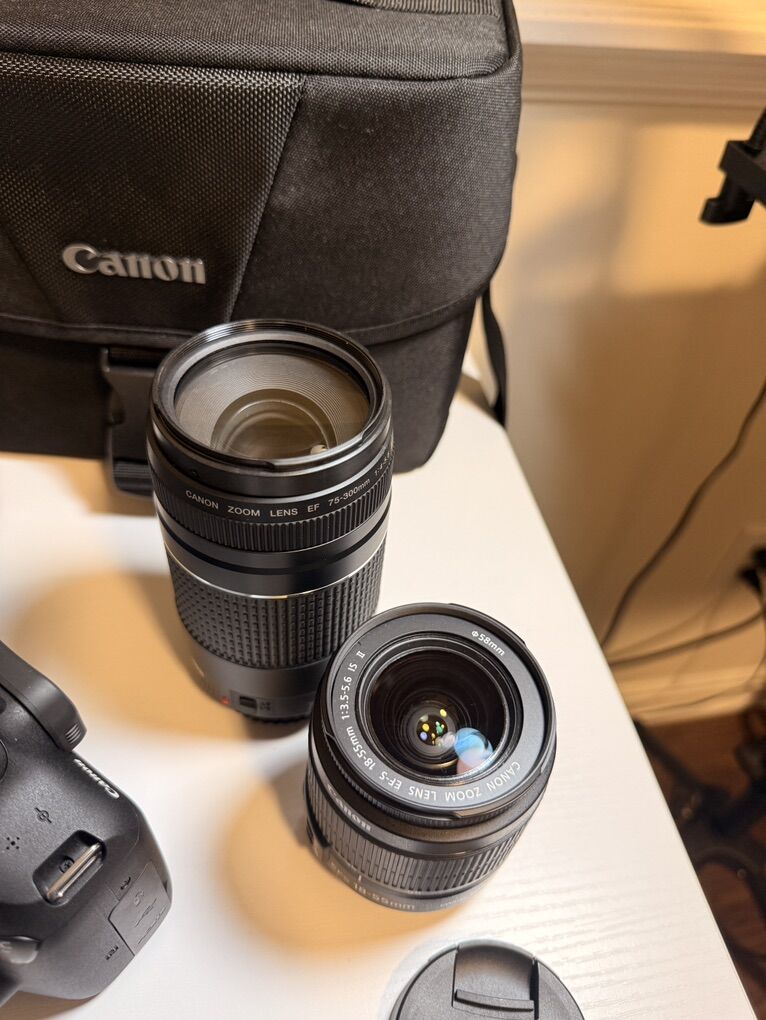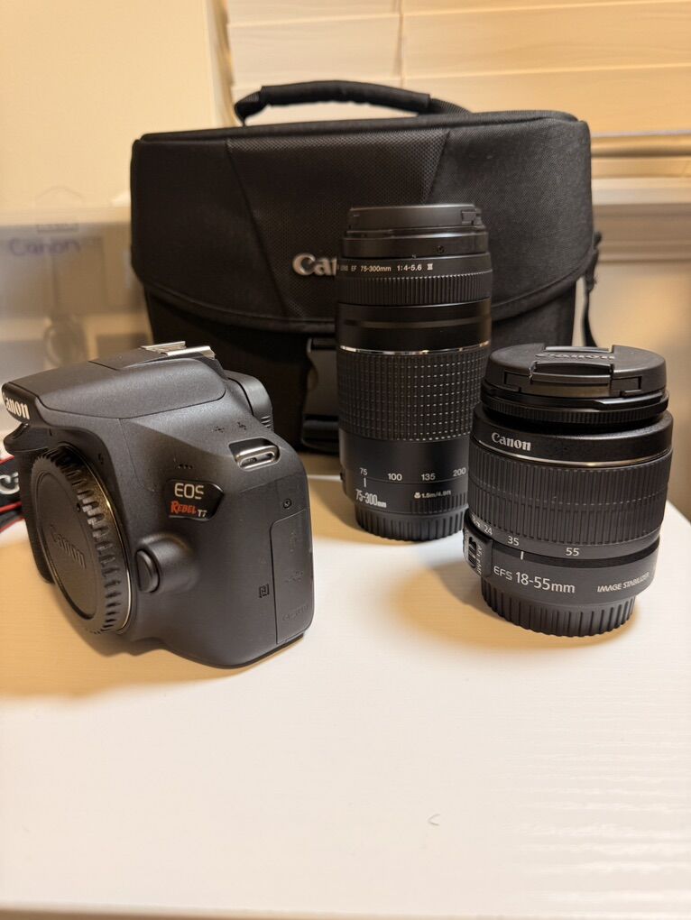 VenmoSelling my Canon Rebel T7 that comes with two lenses original battery and charger. This camera is perfect condition no scratches or dents very well taken care of only had for 9 months. Also comes with two extra batteries and charger and two tethering cables that can be hooked up to your iPad or laptop using the capture one app so you can view your pictures as you are taking them and your clients can see photos as your shooting them. Only cash or Venmo