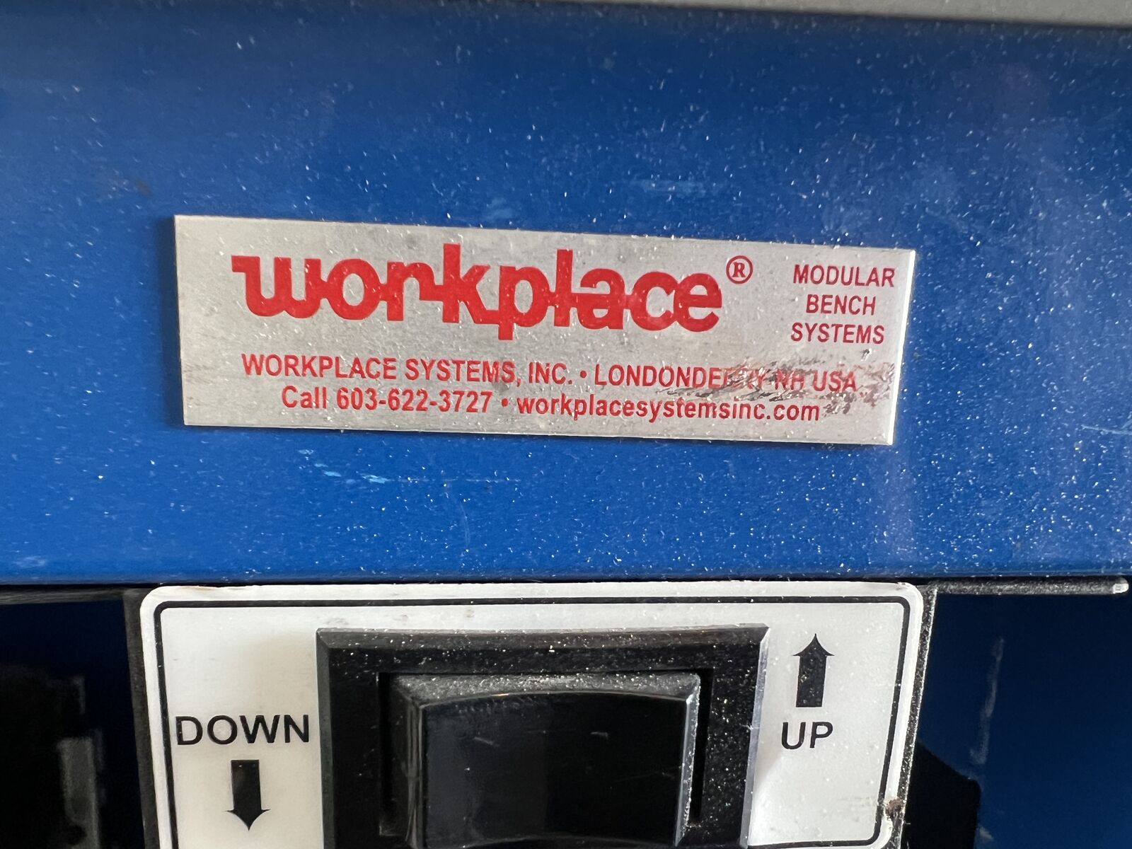 VenmoModular work station with shelving and desk with adjustable electric height works by a switch and when lowered all the way the wheels allow you to move it around easily. Made of power coated steel tubing and laminate top that can be replaced with any top of your choosing. One cord which powers legs power strip and under shelf light all in one. I’ll take more pics once I clean it out. Very heavily built and too heavy to lift into truck bring a trailer to load it into with help.