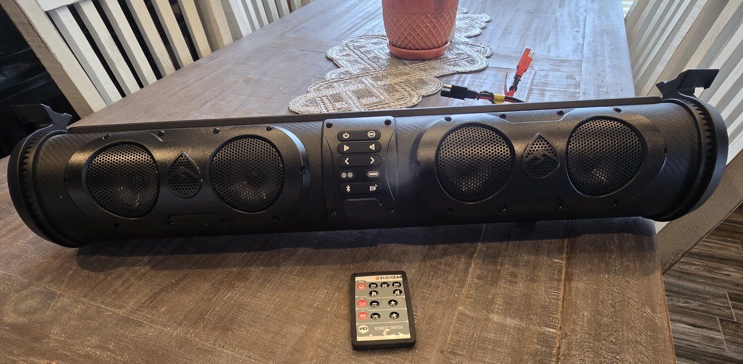 Brand Logo The marine-grade ECOXGEAR® SoundExtreme Speaker Bar 26" boasts a patent-pending IP66 highly water-resistant enclosure for 100% waterproof, dirt-proof, dust-proof, adventure-proof performance. This sound bar for off-road vehicles, boats, and more pumps out an incredible 500W of your favorite audio from 8 rugged speakers: 2 tweeters, 4 midrange, and 2 side-mounted woofers. 2 internal, independently sealed cavities provide true left and right stereo sound. Good for ATV . UTV Asking $360 OBO
