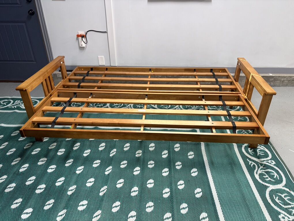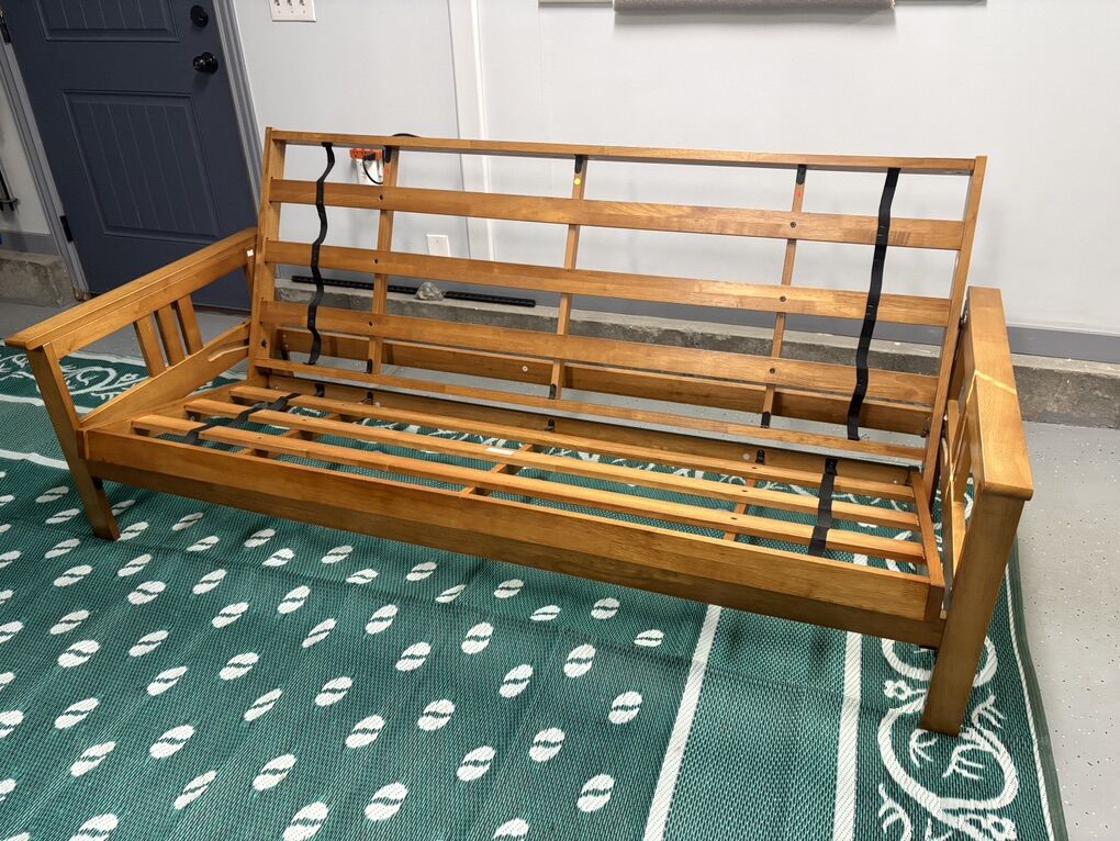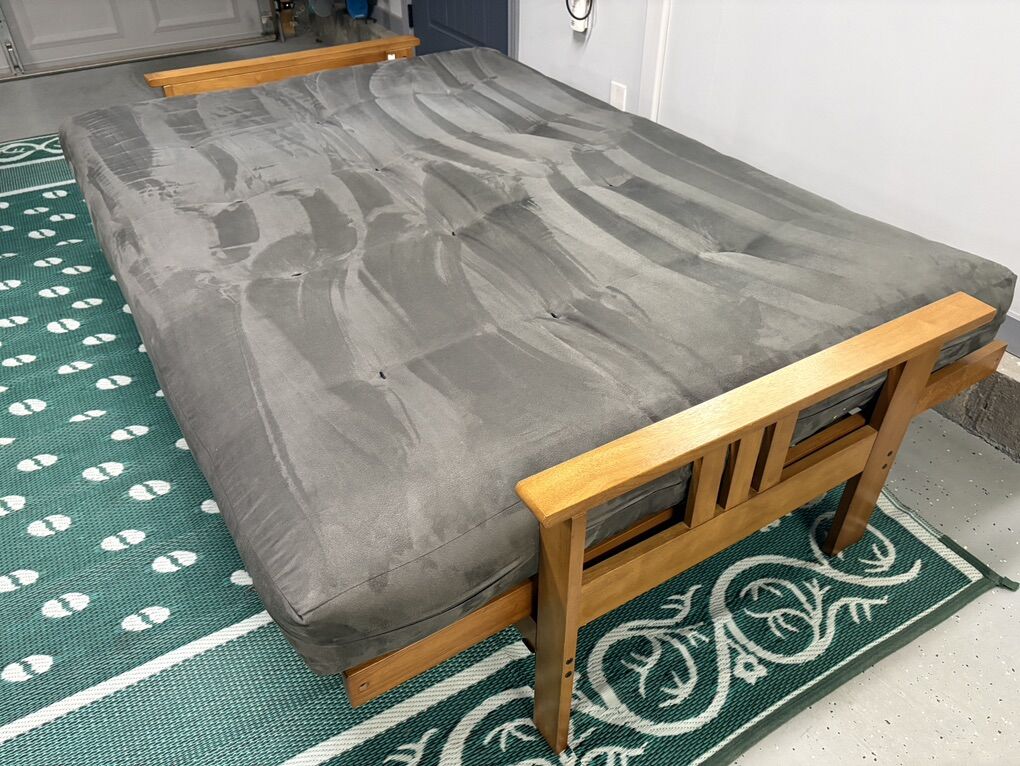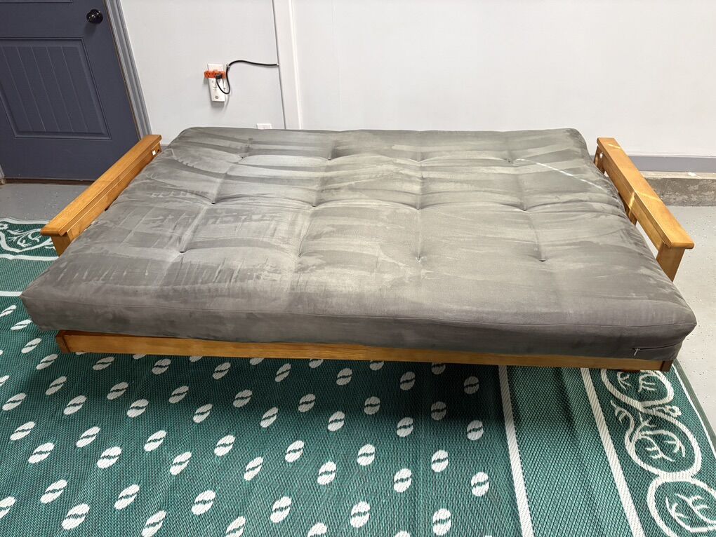 PayPalSit, lounge or sleep on the multi functional Futon Set. This unique and versatile full size futon sofa easily converts to a full size bed. The suede upholstery and light honey oak finish wood frame fits easily in most rooms. Originally was $550.