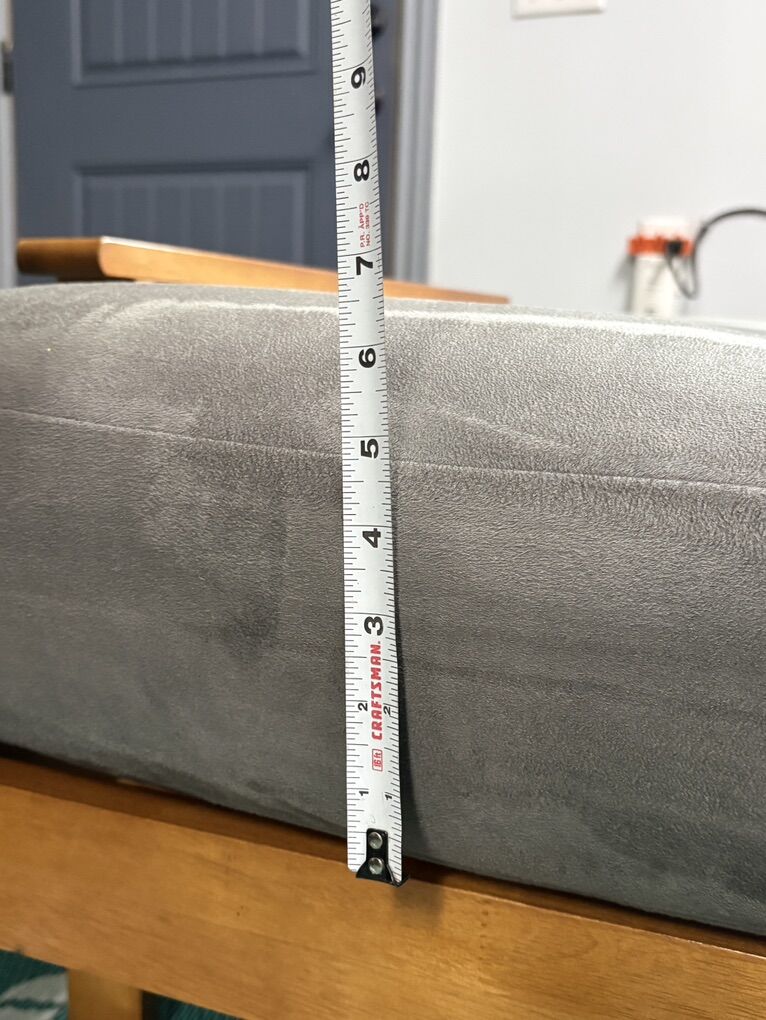 Set Includes: Futon Mattress, Futon Frame Futon Frame Features: Side Loaded Technology Frame Material: Solid Hard Wood Leg Material: Wood Wood Finish: Honey Oak Finish: Stained Fabric Color: Grey Textile Material: 53% Leather, 42% Polyester, 5% Cotton Fill Material: Cotton Mattress Thickness: 8 Inches Mattress Core Construction: Foam and 294 Innerspring coil Care and Cleaning: Spot Clean Bed Dimensions: 75L x 54W x 8H Frame Dimensions: 80L x 37D x 33H