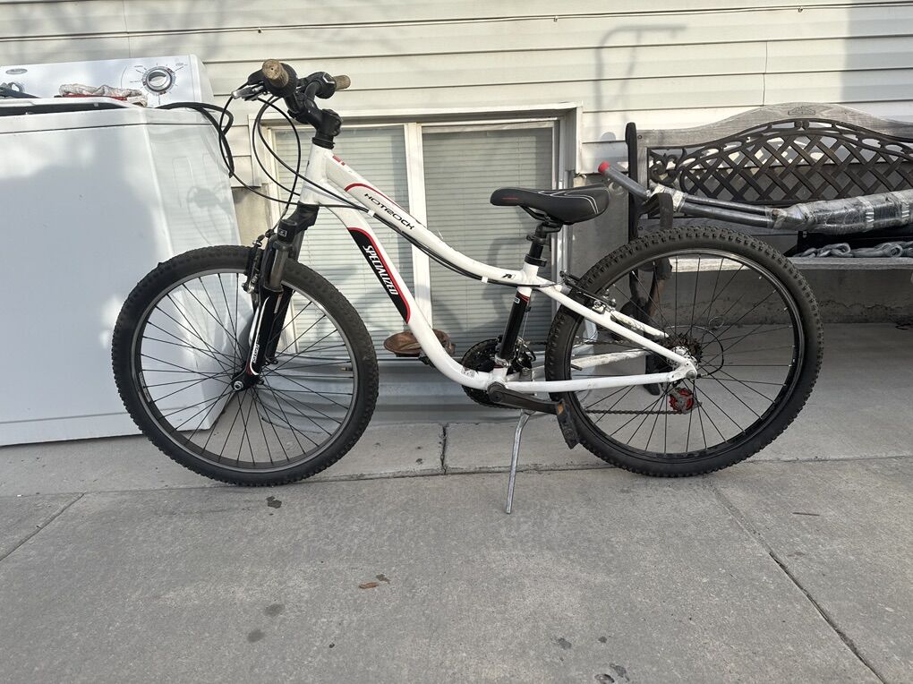 This Bike is still in excellent condition still in excellent shape. Both tires hold air tire size is 24 Seat is good, handle bars are good , pedals are good, Aluminum Frame is still solid & has no cracks, Brakes work great and shifters work great 8 speed & front suspension works great Ride smooth with no issues