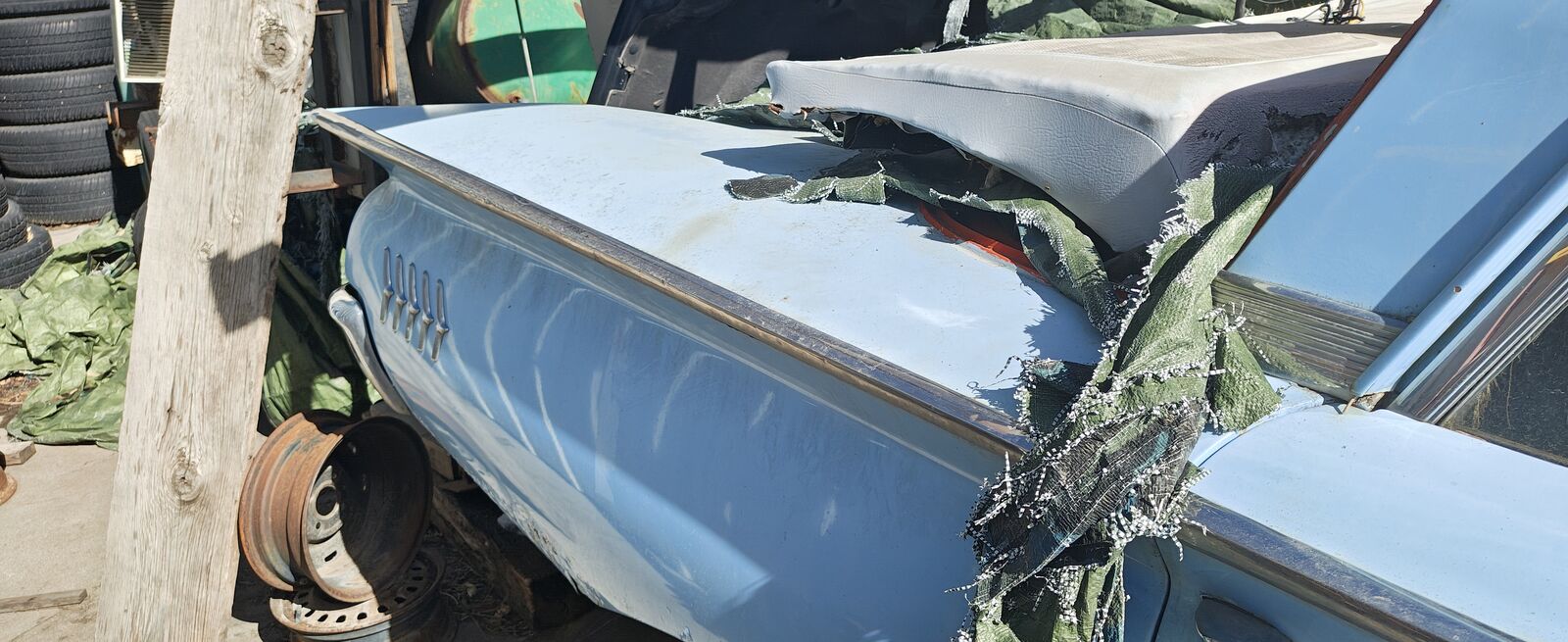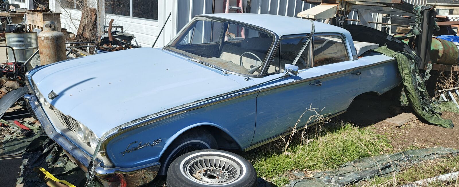 1960 Fairlane 500 missing back window but really cool car with the sideways fins about the only year almost has the 352 and under the code it says high performance for then I guess it was probably it's good engine not running at the moment but can be easily came with 100 spoke rims but they have some rust I have five brand new 14-in white wall tire for it. Anybody interested give me a holler and give me a offer Mike 8017258422