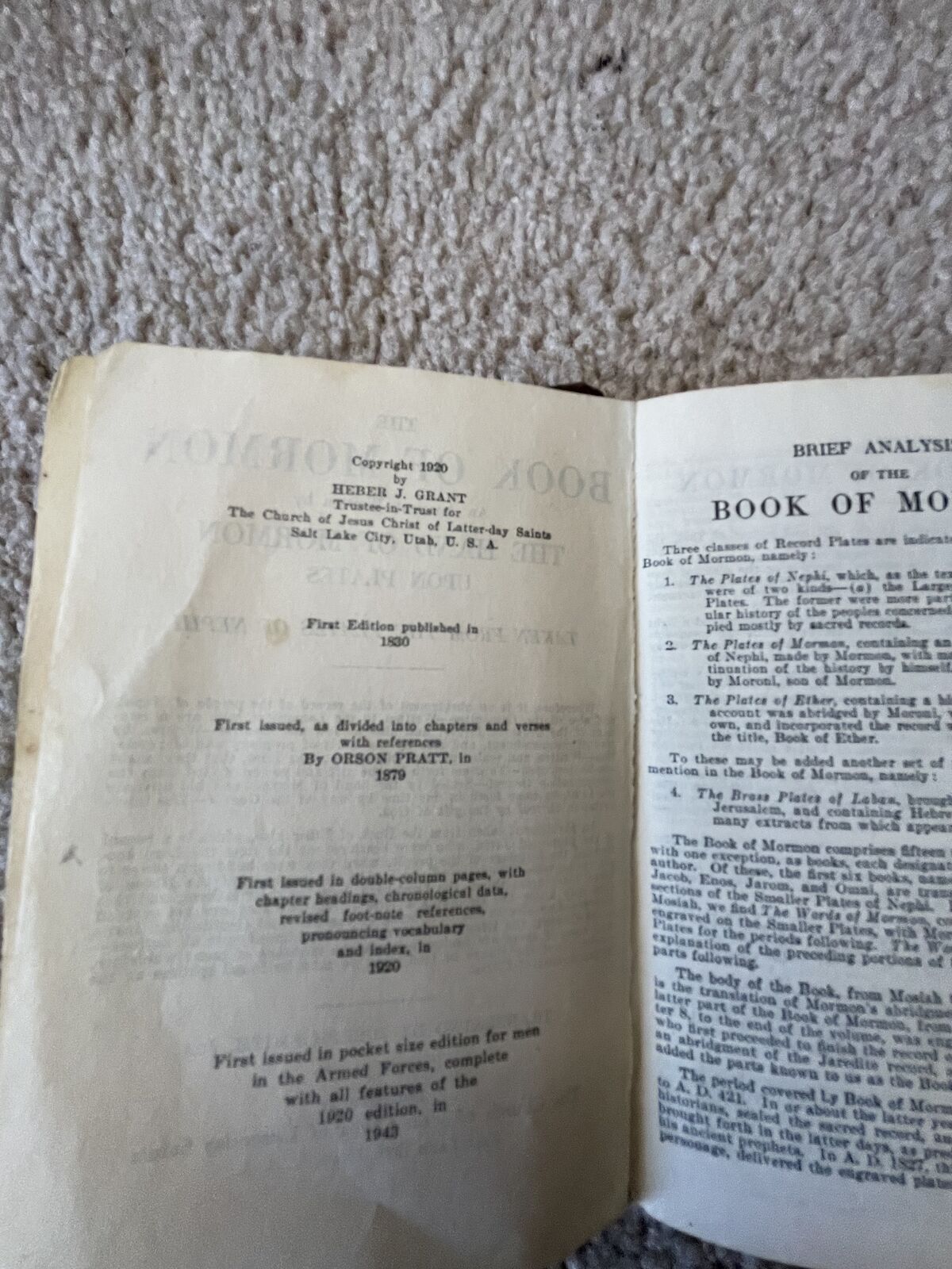 Old LDS Church Books, Book of Mormons, Gospel Philosophy, Ancient Apostles, etc.. Some are in good shape, couple in rough shape. See pictures of books i am posting.