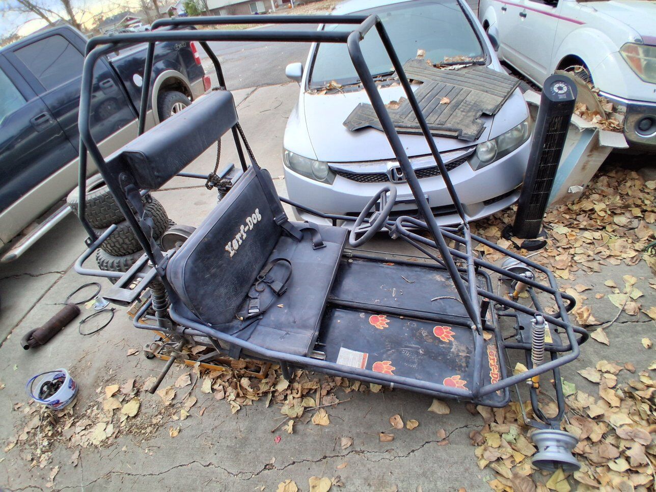 Classic Yerf-Dog go-kart project. Includes full frame, 4 wheels, chain, sprocket/gear, brake line, brake pad, and other miscellaneous parts. Wheels will not work without some modification. Great project build or parts kart. Asking $300 OBO (willing to negotiate).