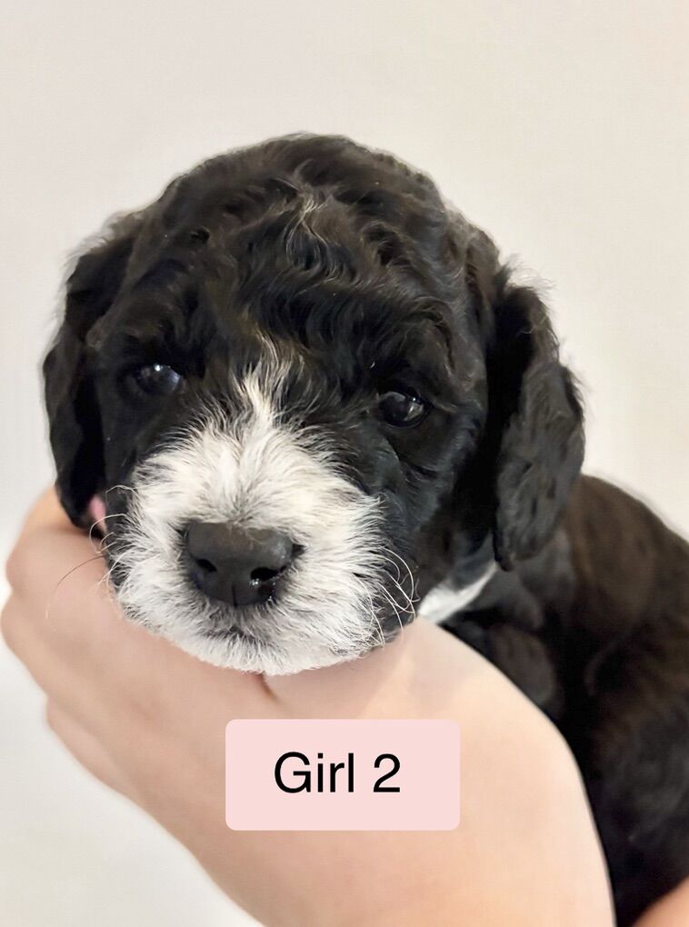 Boy 2-$1200 This little man is our second smallest puppy. The smallest puppies in our other litters range from 3-6 lbs fully grown. It’s a bit early to tell but he may have blue eyes like his dad. He is being sold with breeding rights and will make a desirable stud for poodles and doodle dogs, especially Bernedoodles. He is so sweet and so cuddly!